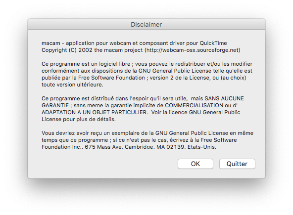 Sous macOS, c’est plus compliqué. Avec les vieilles versions de macOS encore compatible avec le code 32 bits, macam fait le boulot. Mais ça passe par QuickTime 7 et une webcam UVC est quand même (beaucoup) plus simple à mettre en oeuvre. j’ai testé sur un MacBook Air sous macOS Mojave (à partir de Catalina ça ne fonctionne plus).