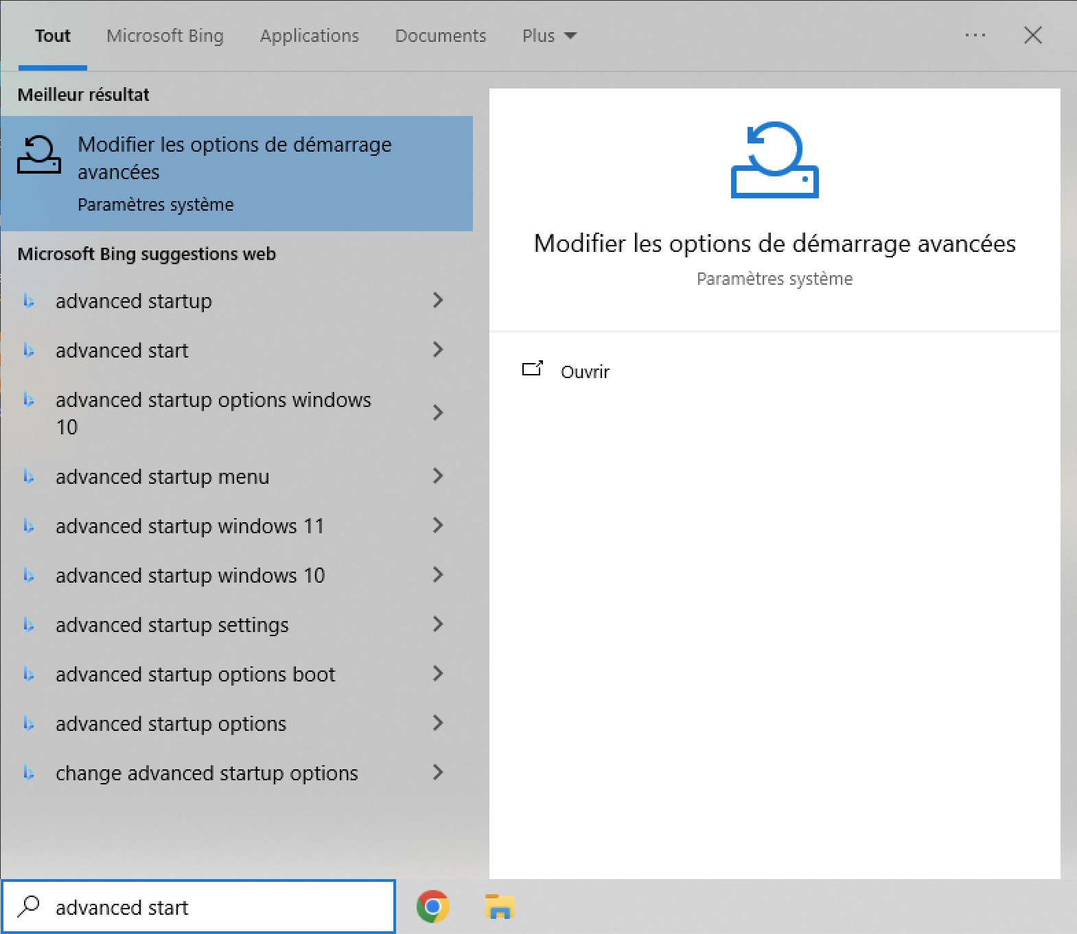Sous Windows 10 (64 bits) dans une machine virtuelle, c’est encore pire. J’ai pris le même pilote, mais il faut d’abord désactiver la protection sur la signature des pilotes. Dans le menu démarrer, taper advanced startup, vous verrez Modifier les options de démarrage avancées. Sous Démarrage avancé, choisissez Redémarrer maintenant.
