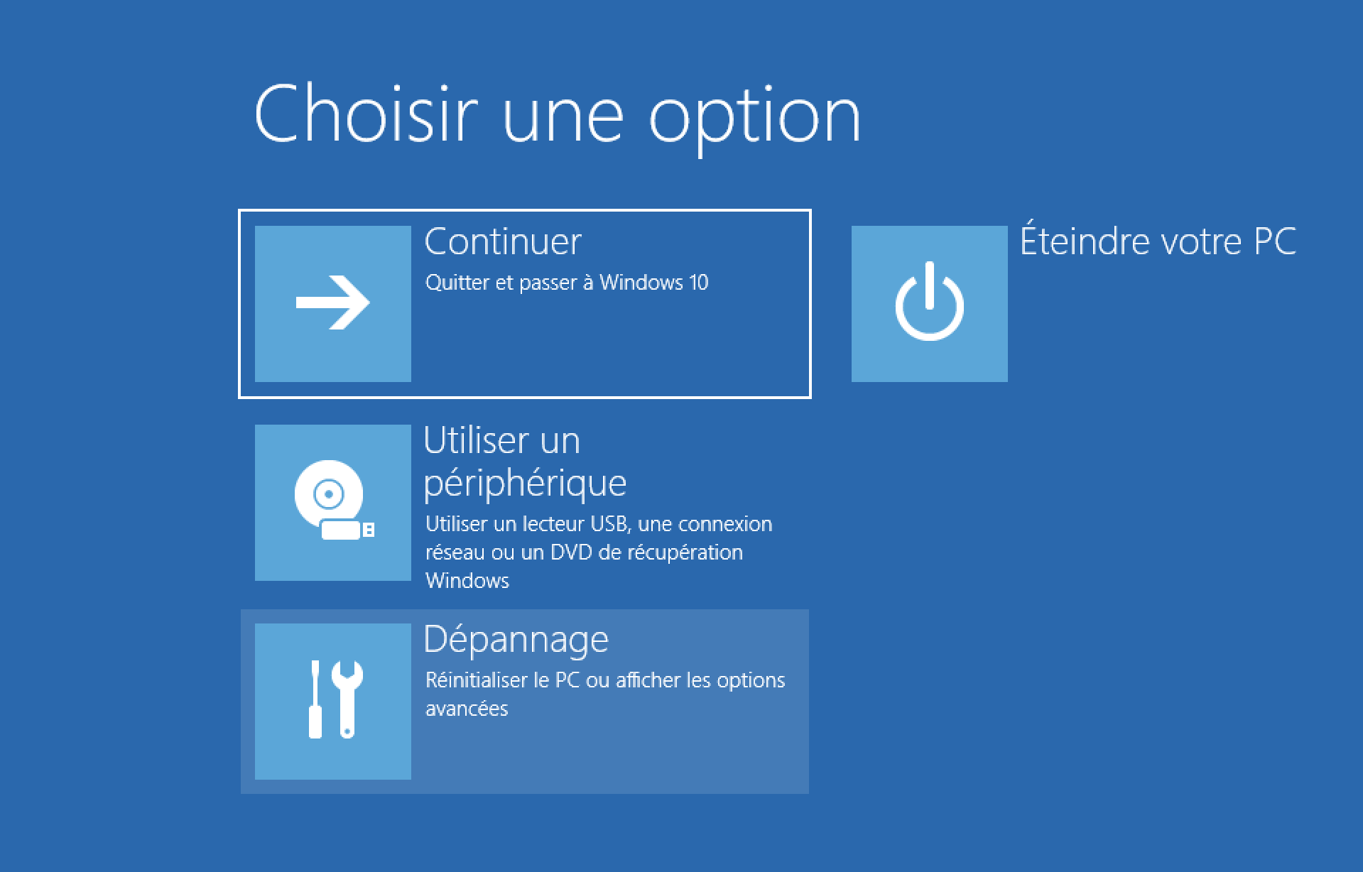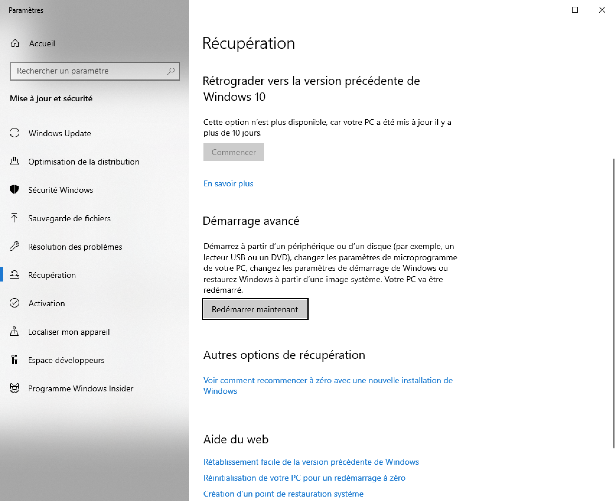 Ensuite choisissez Dépannage, puis dans la fenêtre suivante Options avancées. Puis Paramètres. Et enfin Redémarrer.