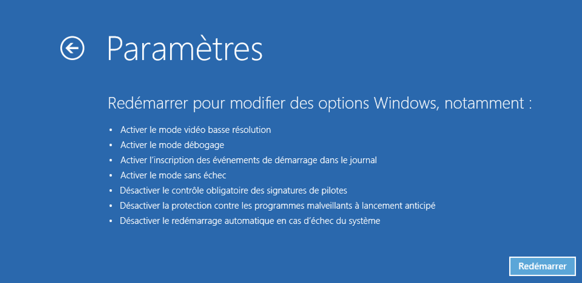 Sur la fenêtre, il faut presser 7 sur le clavier, pour désactiver la signature obligatoire pour les pilotes (ouf).