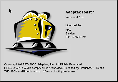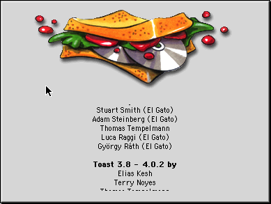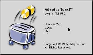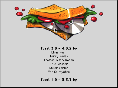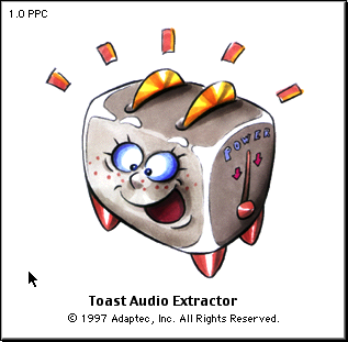 Mais il y a quand même un autre Easter Egg. Si vous pressez option en cliquant sur -> About Adaptec Toast, vous verrez… un toast. Ça fonctionne aussi avec Toast Audio Extractor, qui a une icône différente mais un Easter Egg du même genre.