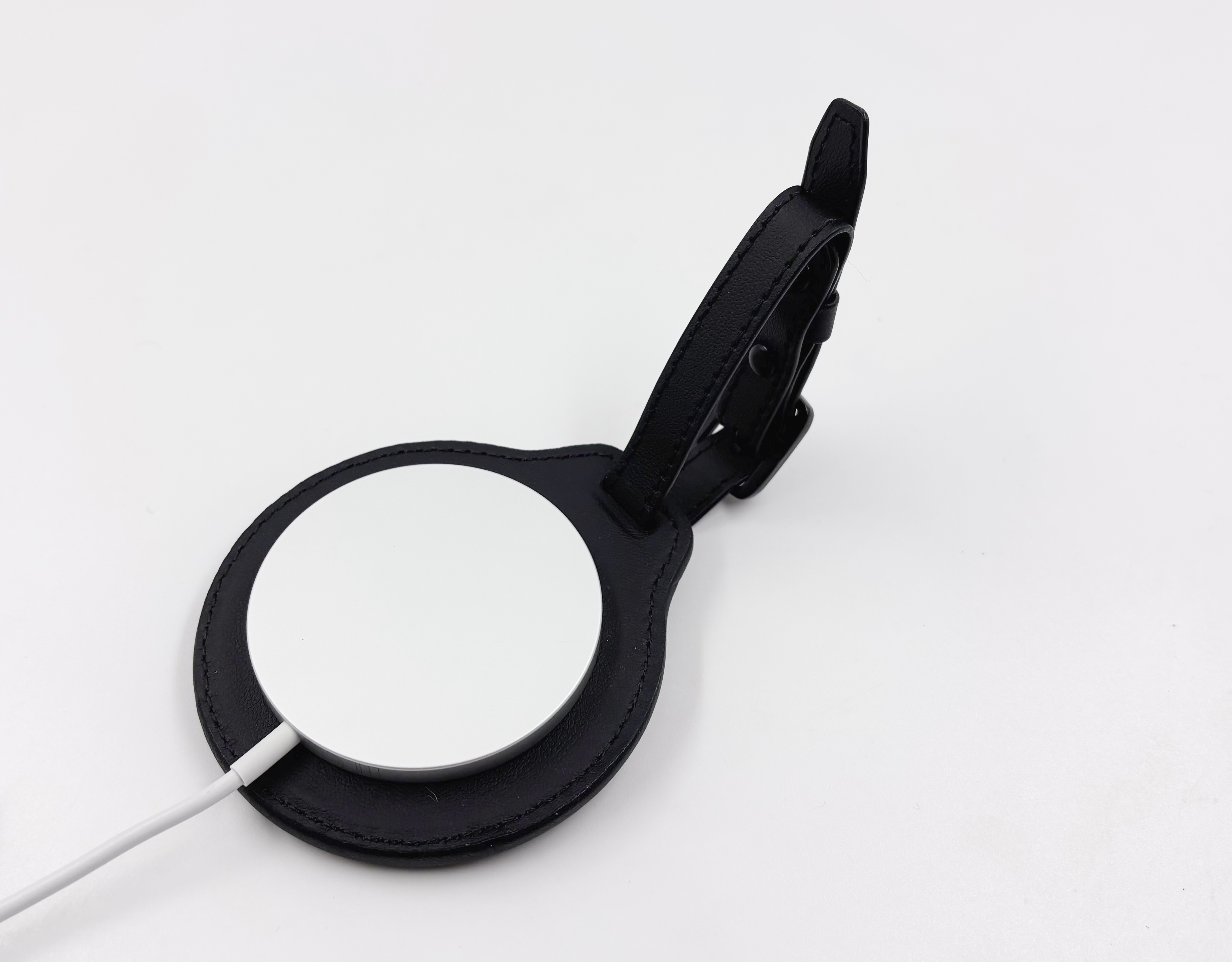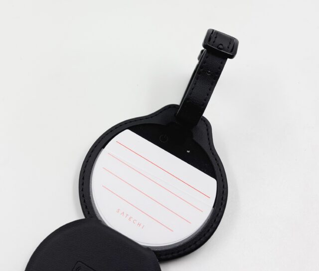 Physiquement, j’ai été surpris : je m’attendais à quelque chose de plus petit. Le traqueur est en cuir végétal (sans précisions, ce n’est pas de la peau d’animal mort, mais probablement du cuir de plastique). On a une sangle avec un mécanisme classique pour ajuster la longueur (pour le fixer sur une valise ou un sac) et un couvercle à clapet aimanté cache le bouton, une petite LED et la zone sur laquelle vous allez écrire votre adresse. Le morceau de papier est protégé par du plastique transparent et Satechi livre un second morceau de papier à la bonne taille. De l’autre côté, on a juste le logo classique de la charge sans fil.
