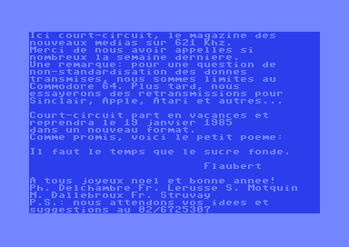 ICI COURT-CIRCUIT, LE MAGAZINE DES NOUVEAUX MEDIAS SUR 621 KHZ. MERCI DE NOUS AVOIR APPELLES SI NOMBREUX LA SEMAINE DERNIERE. UNE REMARQUE: POUR UNE QUESTION DE NON-STANDARDISATION DES DONNES TRANSMISES, NOUS SOMMES LIMITES AU COMMODORE 64. PLUS TARD, NOUS ESSAYERONS DES RETRANSMISSIONS POUR SINCLAIR, APPLE, ATARI ET AUTRES…..COURT-CIRCUIT PART EN VACANCES ET REPRENDRA LE 19 JANVIER 1985 DANS UN NOUVEAU FORMAT.