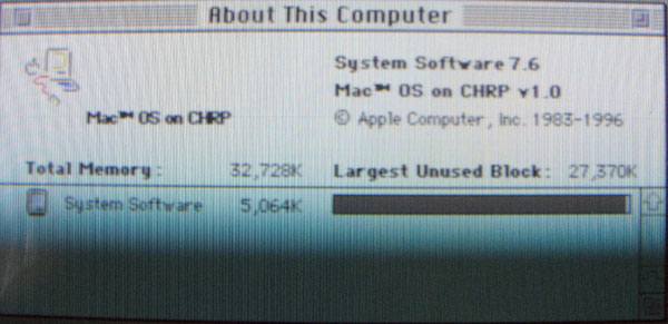 On apprend que la machine a plusieurs noms de code, dont Viper (le matériel), Orient Express (probablement la machine complète) et System Opus. C’est une tour assez classique, la carte mère a des emplacements EISA (assez étonnant), des ports série de PC (DE-9), des ports série de Mac (Mini DIN 8), du SCSI, de l’ADB, etc. On peut aussi voir du PCI et quelques composants assez standards. Un vieil article indique qu’il y a aussi du PS/2. La machine dont on a les photos démarre sous Mac OS 7.6 CHRP, probablement avec le disque qui a été (re)découvert récemment. Le processeur est visiblement un PowerPC 604e à 233 MHz.