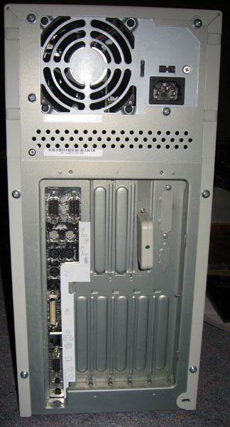 On peut voir du série en DE-9, du série en Mini DIN8, de l’ADB ou du PS/2, du SCSI (je pense), une sortie VGA (DE-15), des prises audio et de l’Ethernet ou un modem.