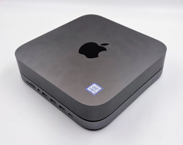 Physiquement, c’est très bien fini : la structure est en plastique, mais l’extérieur en métal. Le gris sidéral n’est pas exactement le même que le Mac mini 2018, c’est un peu dommage : il est plus clair. Mais le Mac mini s’sinère parfaitement dans l’emplacement, c’est stable et la couleur ne jure pas trop.