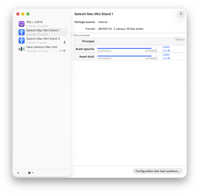 La sortie audio est pratique sur un point : elle est plus accessible que celle à l’arrière du Mac mini. Je n’ai rien pour tester sa qualité, mais elle fonctionne avec le microphone d’un kit mains-libres. Satechi a bien fait les choses sur un point : elle est invisible quand il n’y a rien de connecté. C’est une fioriture pratique mais pas généralisée qui permet d’éviter que macOS passe sur une sortie audio incapable d’émettre du son. La sortie prend le nom de de la station d’accueil, là aussi un point pratique. Le seul défaut bizarre est que la sortie ne propose qu’une fréquence d’échantillonnage de 48 kHz en 16 bits, ce qui est un peu étonnant. Une bonne partie des contenus actuels est encore en 44,1 kHz et c’est toujours mieux de pouvoir modifier ça. Mais ici, c’est impossible.
