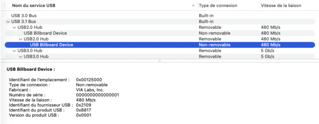 En regardant comment était géré le hub au niveau de macOS, j’ai vu un drôle de périphérique USB : USB Billboard Device. Après quelques recherches, j’ai découvert un truc : c’est un périphérique USB virtuel qui est là pour indiquer au système d’exploitation si une prise USB-C a des fonctions alternatives, dans la majorité des cas la prise en charge de la vidéo en DisplayPort. Dans le cas du hub de Satechi, la prise USB-C ne gère pas la vidéo, et ce composant permet de prévenir le système. Sous Windows, il y a un message pour l’indiquer. Assez bizarrement, il y a deux USB Billboard Device, même si le second est lié au second hub, qui n’a pas de prise USB-C. Sous Windows, il est parfois vu comme éjectable, ce qui n’est pas logique (macOS m’indique bien qu’il ne l’est pas).