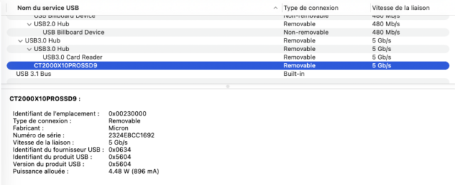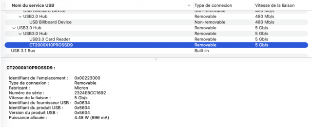 Dernier point à noter, Satechi propose une version avec un emplacement M.2 pour un SSD, mais elle est vraiment beaucoup plus onéreuse (120 €). L’emplacement M.2 est relié en USB à 10 Gb/s, et la prise USB-C et la première prise USB-A aussi. Le premier des hubs en cascade est probablement une version plus moderne, du coup. Une petite différence qui ne vaut vraiment pas la différence de prix.