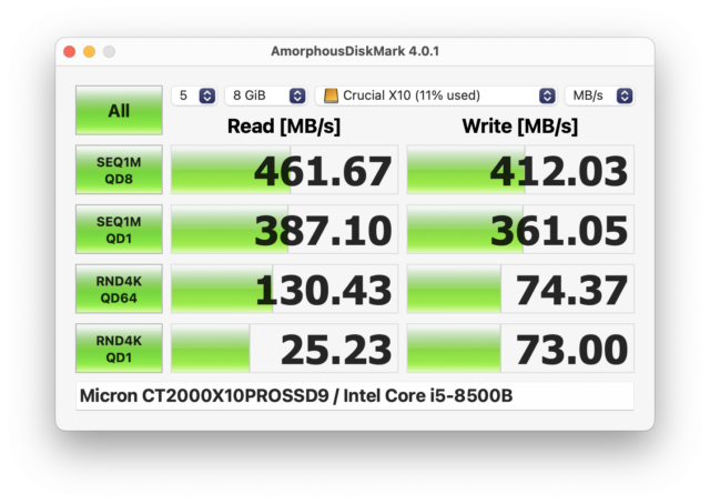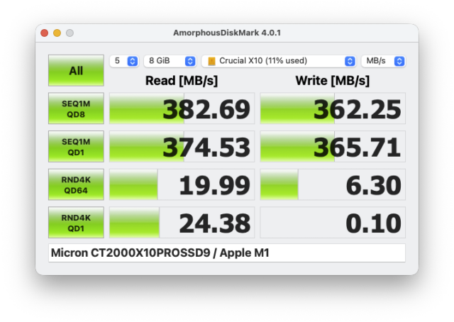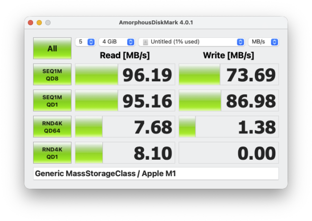 Comme souvent, on a deux hubs USB intégrés en cascade. Du coup, je commence par les ports USB. La prise USB-C est au premier niveau, et elle est limitée à 5 Gb/s (dommage). Question performances, ça dépend du Mac : un 2018 (Intel) est nettement plus rapide qu’un M1 par exemple. La prise USB-A à gauche du port USB-C est au même niveau en interne, alors que les deux autres sont sur le second hub USB interne, comme le lecteur de cartes. Comme toutes les prises sont à 5 Gb/s et que le lecteur de cartes n’est pas spécialement rapide, la cascade de hub USB ne devrait jamais poser de soucis de performances, mais c’est préférable de mettre les périphériques qui intègrent aussi des hubs sur une prise au plus bas niveau. On peut aussi regretter l’absence d’alimentation externe : tout dépend du Mac et donc il faut éviter de mettre trop de périphériques USB gourmands.