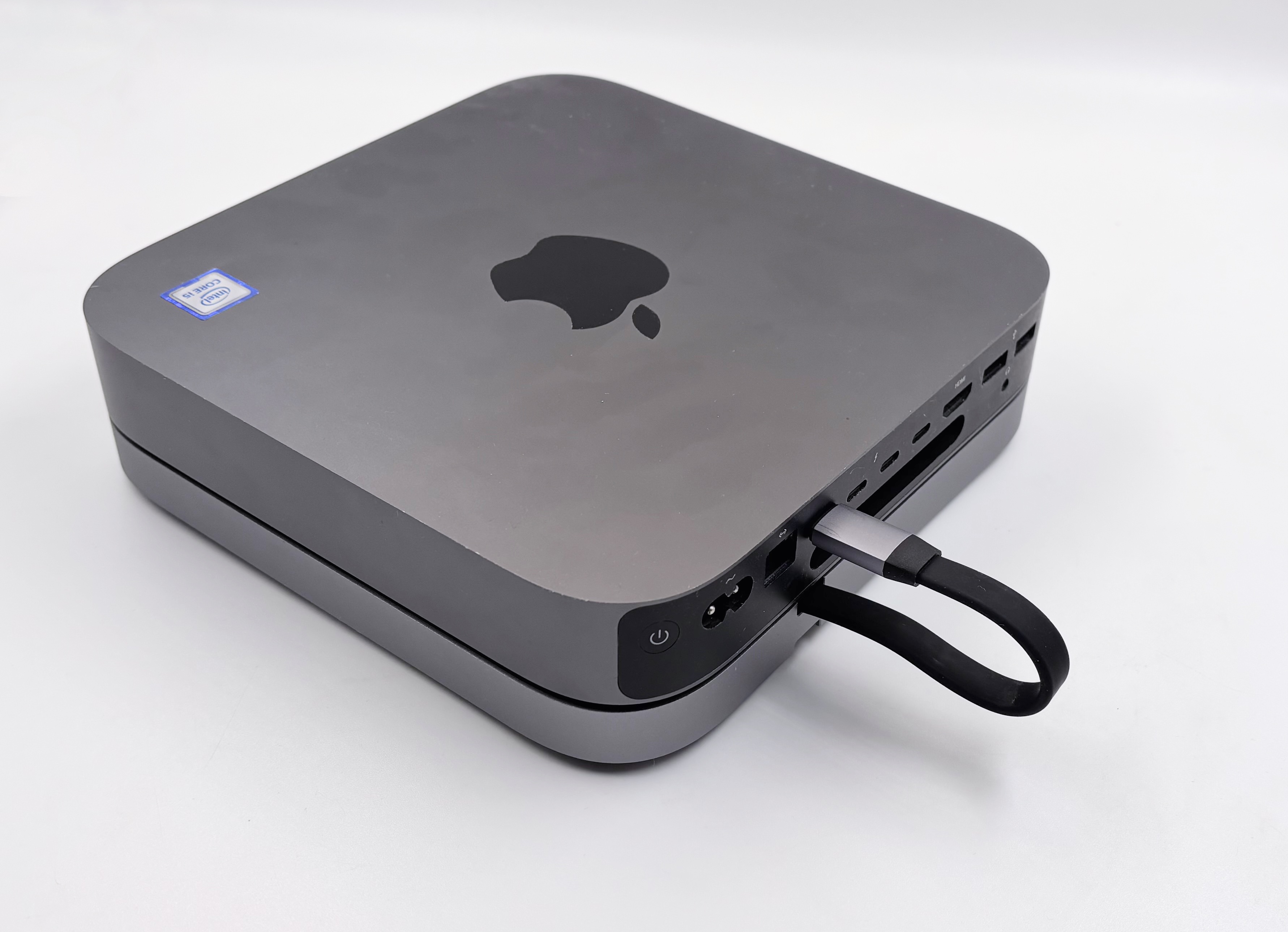 Physiquement, c’est très bien fini : la structure est en plastique, mais l’extérieur en métal. Le gris sidéral n’est pas exactement le même que le Mac mini 2018, c’est un peu dommage : il est plus clair. Mais le Mac mini s’sinère parfaitement dans l’emplacement, c’est stable et la couleur ne jure pas trop.
