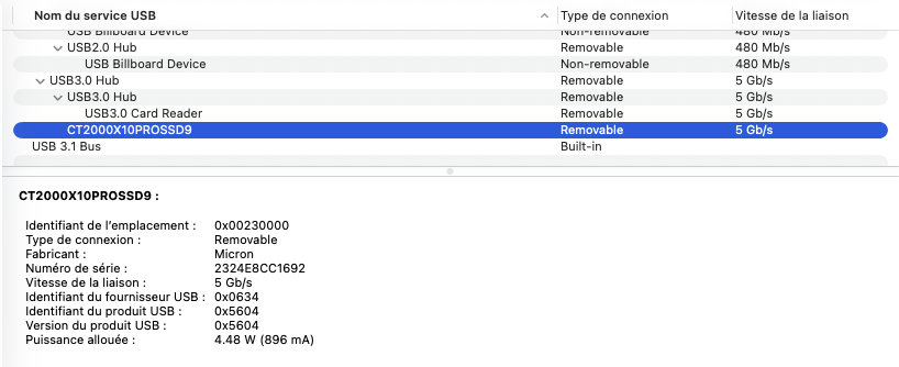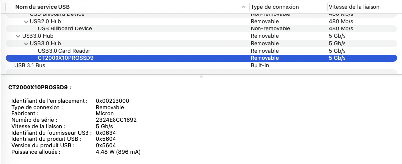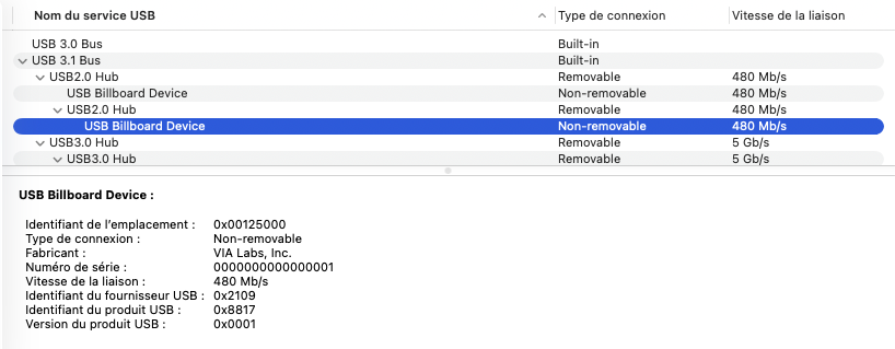 En regardant comment était géré le hub au niveau de macOS, j’ai vu un drôle de périphérique USB : USB Billboard Device. Après quelques recherches, j’ai découvert un truc : c’est un périphérique USB virtuel qui est là pour indiquer au système d’exploitation si une prise USB-C a des fonctions alternatives, dans la majorité des cas la prise en charge de la vidéo en DisplayPort. Dans le cas du hub de Satechi, la prise USB-C ne gère pas la vidéo, et ce composant permet de prévenir le système. Sous Windows, il y a un message pour l’indiquer. Assez bizarrement, il y a deux USB Billboard Device, même si le second est lié au second hub, qui n’a pas de prise USB-C. Sous Windows, il est parfois vu comme éjectable, ce qui n’est pas logique (macOS m’indique bien qu’il ne l’est pas).
