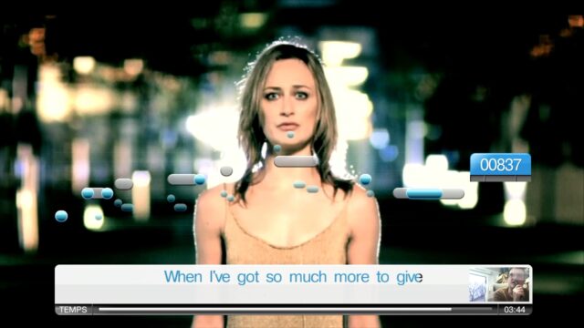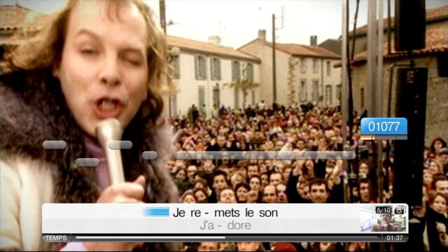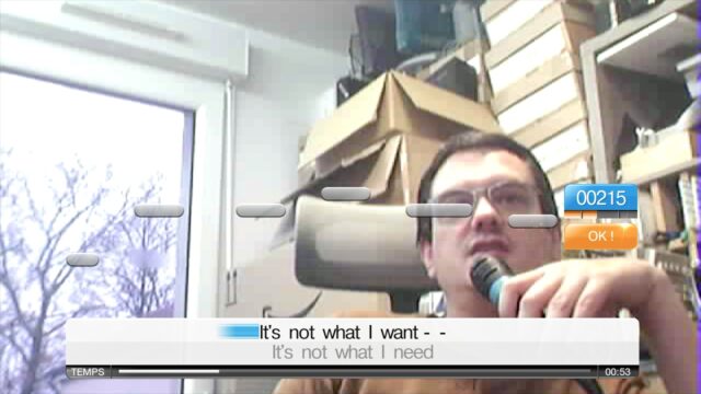 Le manuel est explicite sur la compatibilité avec la caméra de la PlayStation 2 (EyeToy). Et de fait, ça fonctionne : une fois la caméra branchée, on a un retour vidéo. On a le choix entre une miniature avec le clip en plein écran, ou la vidéo en plein écran. Dans les cas, c’est assez moche. Pour les clips parce que SingStar n’est pas en HD, et les clips que j’ai pu regarder sont en (mauvaise) SD. Pour la vidéo en plein écran, parce que la caméra de Sony est en 320 x 240 avec une compression assez élevée. Je ne vous mets pas de vidéo parce que ce n’est pas très intéressant de me voir assis dans mon bureau, surtout avec de l’audio sous copyright.