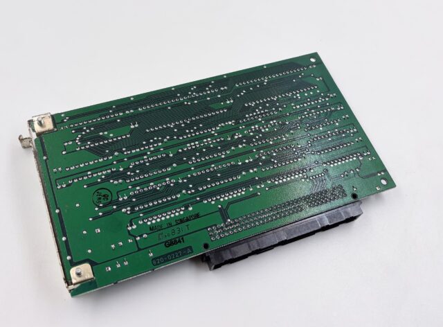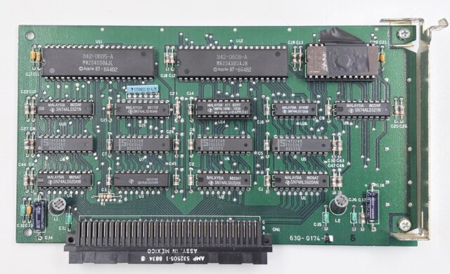 La carte pour Macintosh II est au format NuBus et a la référence 630-0174-A. Comme pour la ROM du Macintosh Plus, les références pour cette carte sont rares. Il y a cet article, celui-ci ou ici, avec de nombreuses autres cartes. Le dernier donne un lien vers le contenu de la ROM, mais ce n’est pas le contenu complet de la ROM, de façon évidente : il n’y a que 4 ko. Mais c’est un sujet sur Tinker Different qui m’a aidé.