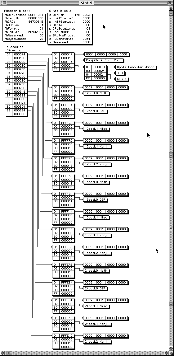 J’ai tenté de sauver le contenu de la ROM avec des outils, mais je n’obtiens que 4 ko. Les données sont les mêmes que celles des autres personnes avec une carte, donc mon dump est correct, je suppose. Des outils Apple me montrent qu’il y a plusieurs polices en ressources (si je comprends bien) mais je ne sais pas comment récupérer ça. Mais c’est visiblement les polices en 12, 16 et 24 points.