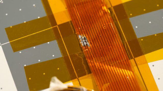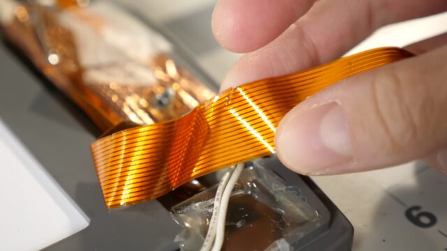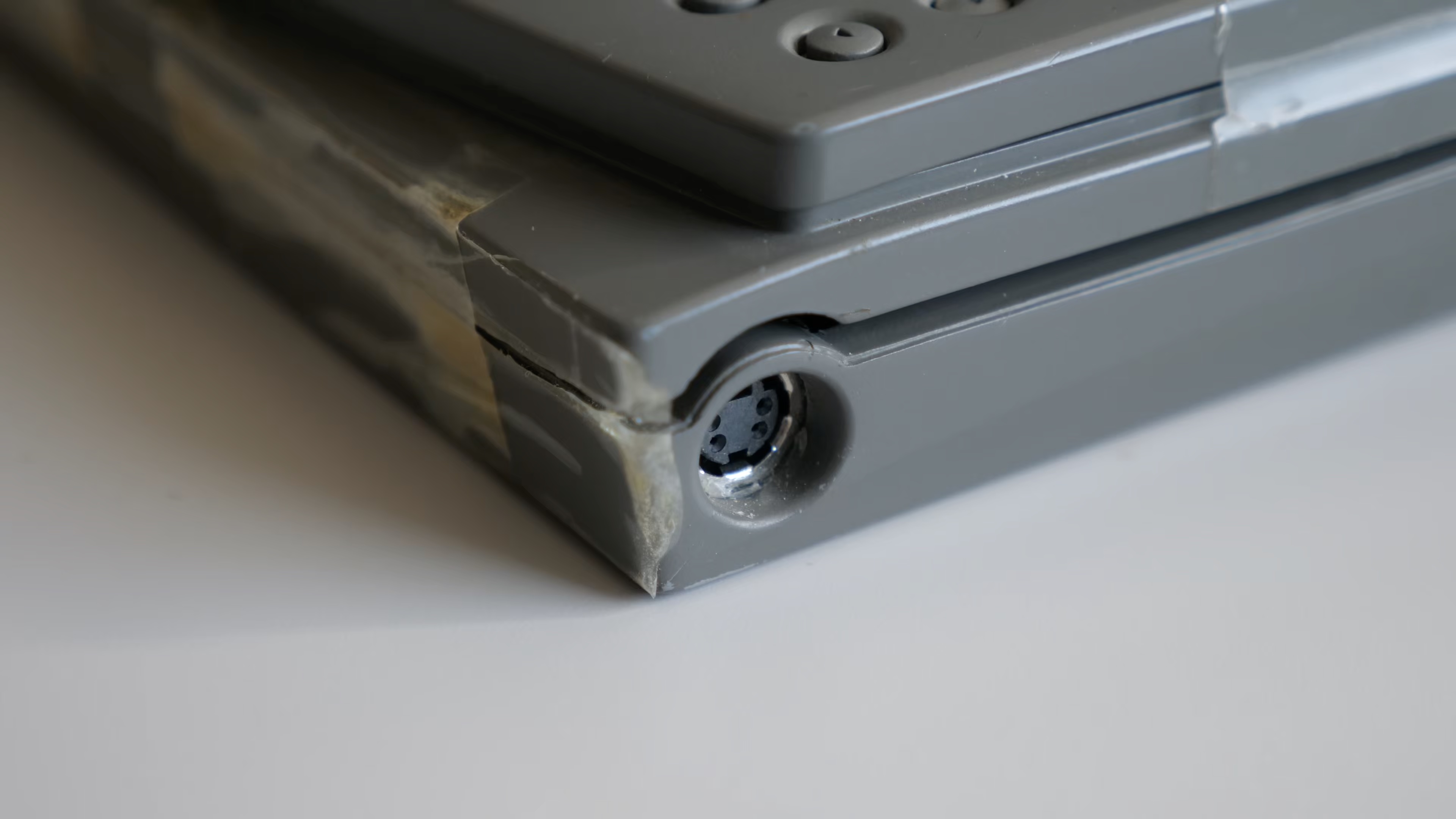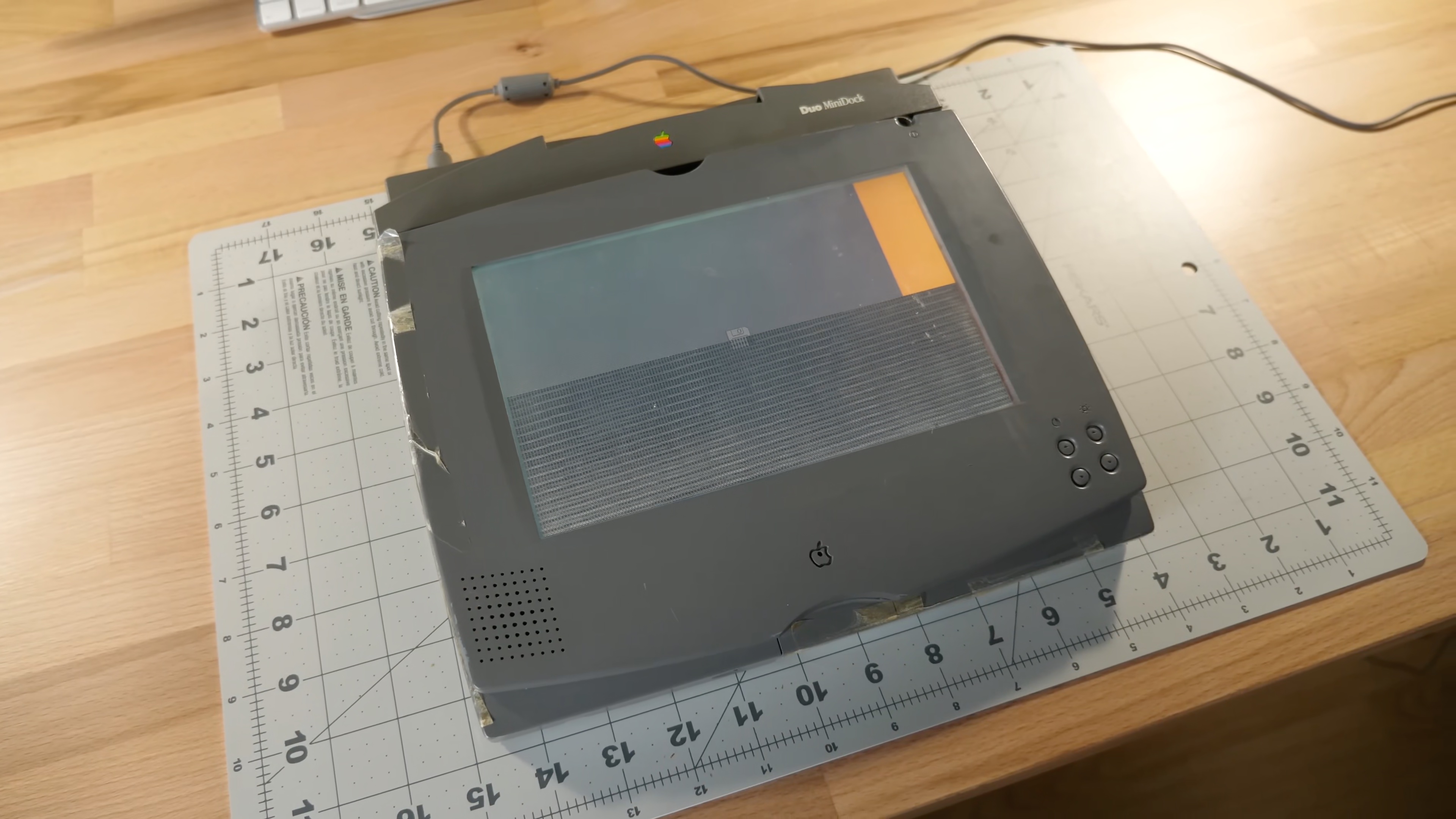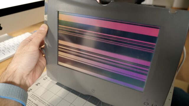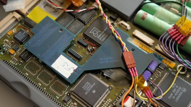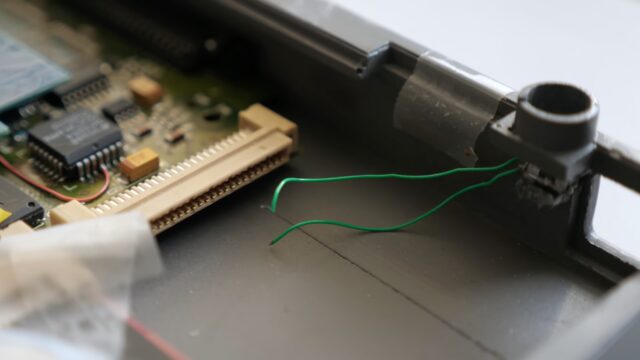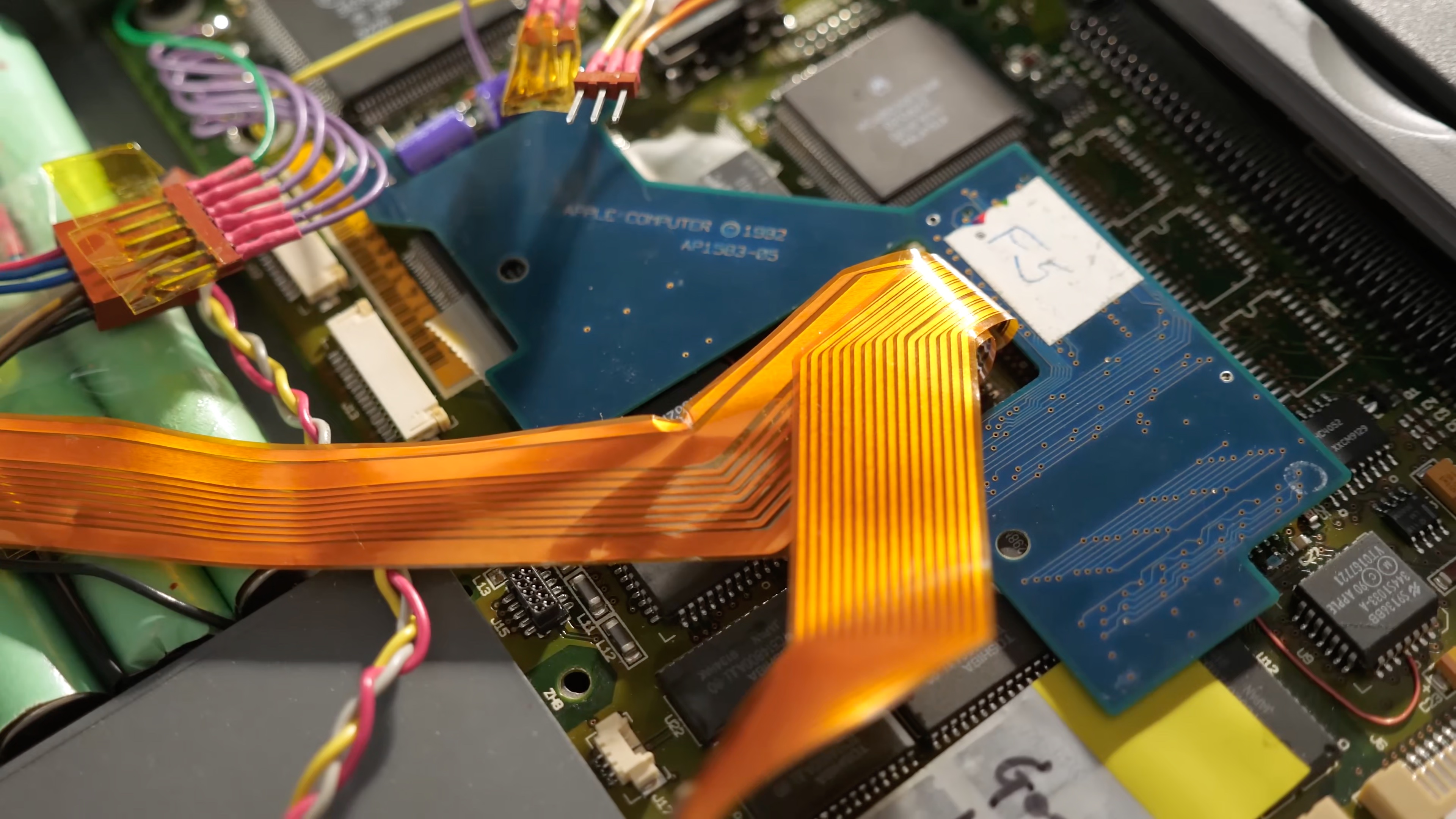 Après avoir remplacé les condensateurs (c’est toujours important), il a tenté de l’allumer. Le soft power ne pouvait pas fonctionner dans son cas, car il passe par une broche de l’ADB qui n’est pas câblée dans le prototype. Il a donc modifié une station d’accueil pour PowerBook Duo – qui a son propre bouton d’allumage – pour la brancher sur le prototype. L’écran ne fonctionnait pas lors des premiers essais, mais après un branchement en règle, il a fonctionné… à moitié. La nappe de connexion était endommagée, mais il l’a réparée (un truc que je ne sais pas faire).