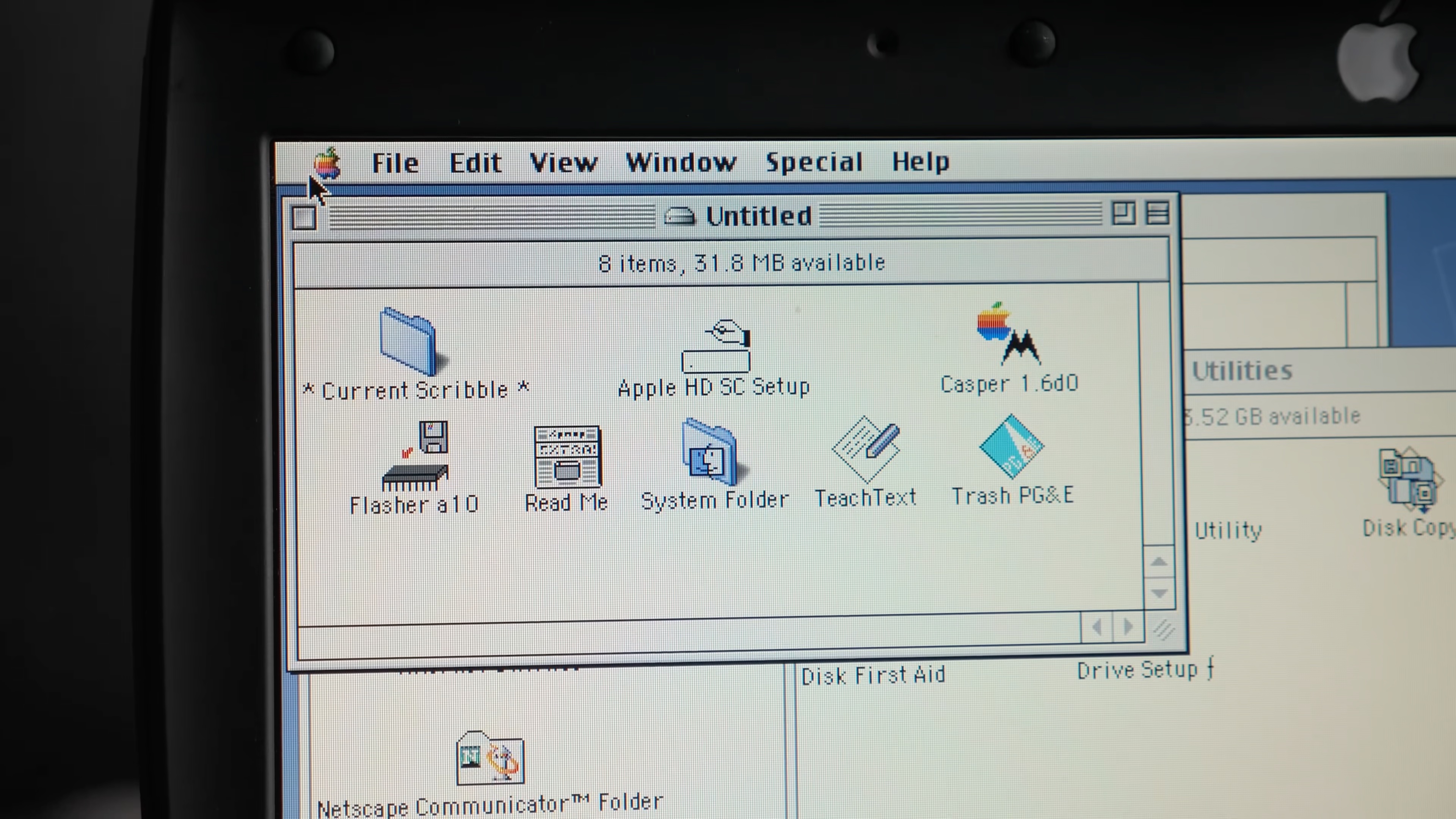 Il commence par présenter la tablette, qui ne démarre pas. On peut voir de l’ADB et des composants qui dérivent directement des premiers PowerBook Duo. Comme le disque dur ne fonctionnait pas, il l’ouvre pour changer un composant. Ce n’est pas recommandé d’ouvrir un disque dur, on est d’accord, mais sur les vieux modèles SCSI, il est possible de remplacer une pièce qui se décompose avec le temps et empêche le bras qui transporte les têtes de lecture de fonctionner. Une fois le disque dur refermé, on peut voir quelques utilitaires Apple.
