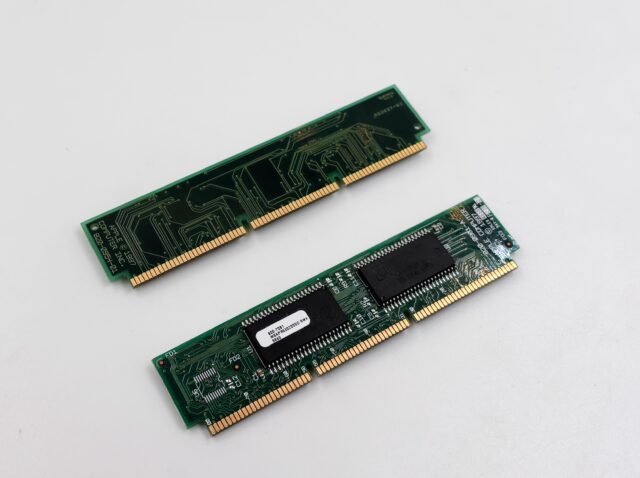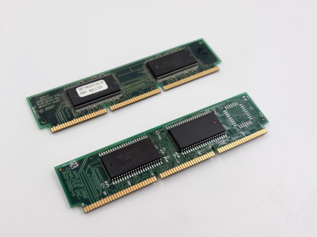 La quatrième est particulière : elle est apparue sur eBay fin 2024, un vendeur en avait un (gros) stock. La barrette contient des puces programmables AMD, et il est donc en théorie possible de flasher le contenu de la ROM pour la modifier. Par rapport à ma ROM en révision C, elle a deux faces, des traces pour d’autres composants et des données légèrement plus récentes. Dans le sujet sur 68KMLA, on peut voir qu’il y a une version plus récente, donc (référence 77D.45F3) avec quelques pilotes mis à jour et des modifications sur la prise en charge du PCI. Pour certains, c’est une modification pour les cartes PCI qui intègrent plusieurs composants avec un pont et dont la compatibilité est moyenne avec les Macintosh. Un document interne lie cette ROM à un « Gossamer Speedbump », c’est-à-dire une version améliorée du Power Macintosh G3 (Gossamer est son nom de code) avec un gain en fréquence. C’est peut-être la version à 366 MHz. La barrette est notée 820-0961-A, avec quatre puces AM29L V800BT.