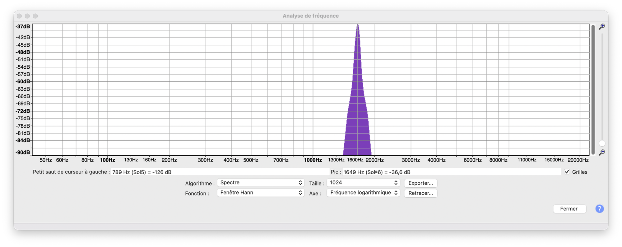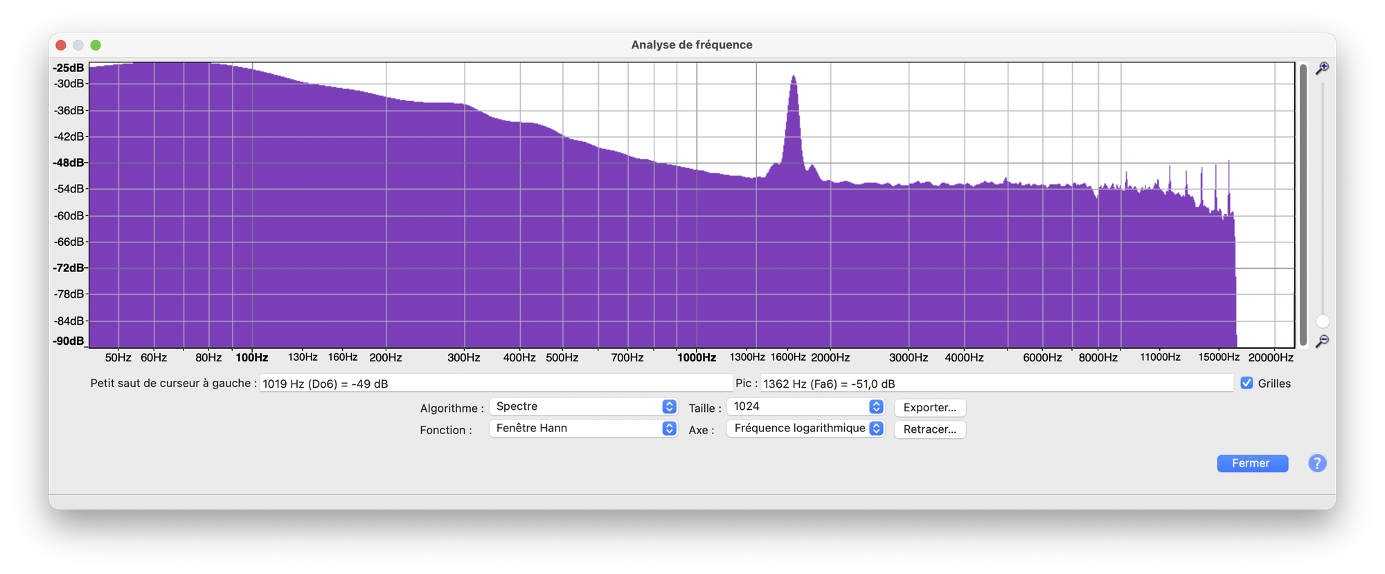 Avec Audacity, j’ai d’abord vérifié la fréquence du code morse (Analyse -> Tracer le spectre). Une fois la fréquence trouvée (vers 1 650 Hz), j’ai fait des filtres passe-bas (1 675 Hz) et passe-haut (1 625 Hz) pour isoler la fréquence rapidement, et une (petite) amplification.
