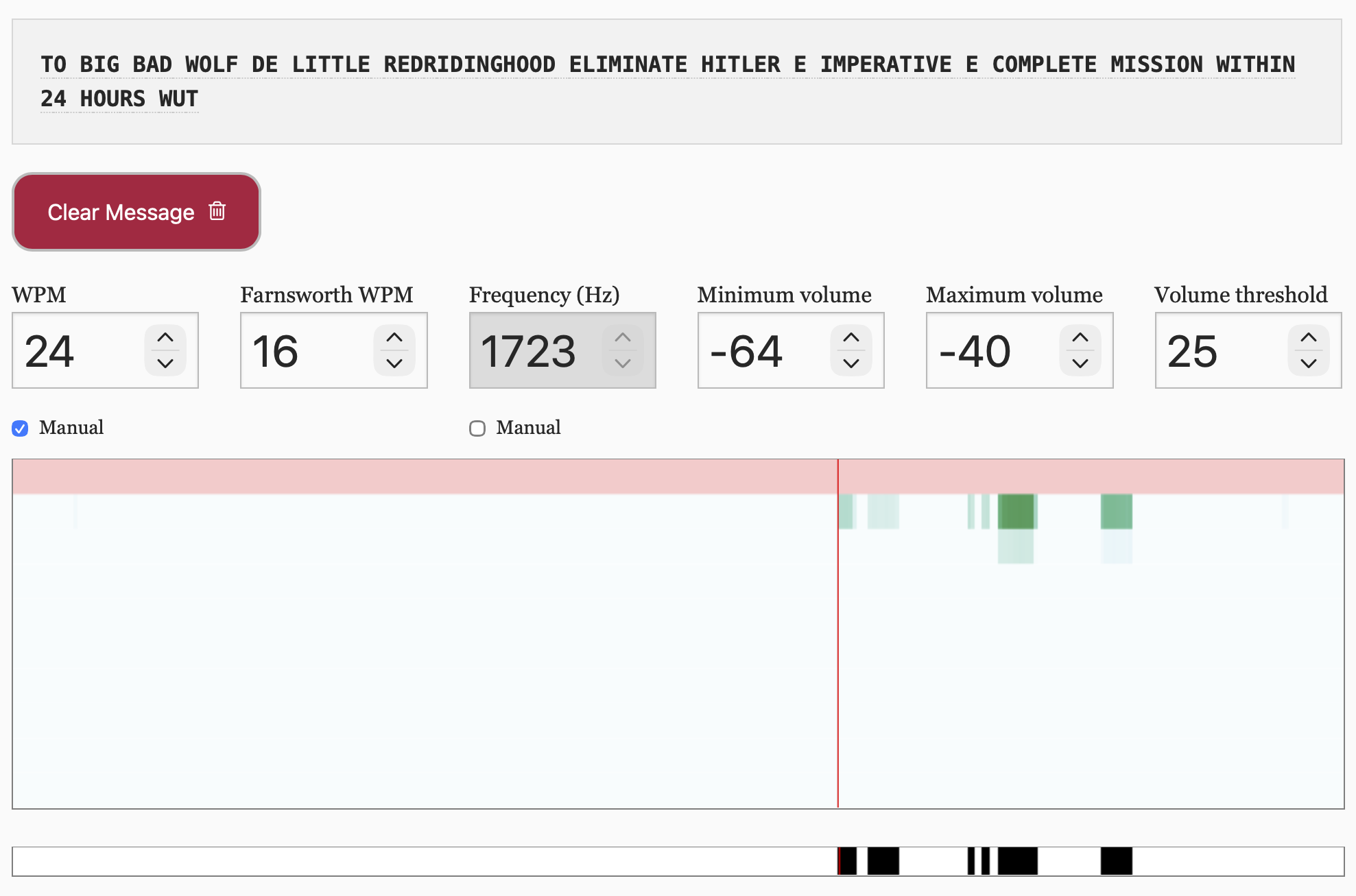 L’étape suivante a été la plus fastidieuse : décoder le morse. J’aurais pu le décoder manuellement, mais j’ai voulu le faire automatiquement. J’ai donc utilisé un site dédié, qui permet d’envoyer le morceau. Et après pas mal de tâtonnements sur les réglages, j’ai obtenu le message. Même après le filtrage, j’avais encore un peu de la musique d’origine, donc il a fallu jouer sur les niveaux pour que ça décode correctement sans prendre en compte ce qu’il y avait en arrière-plan. Dans la capture, il y a une petite erreur sur la fin (WUT au lieu de OUT) et des E qui se baladent, mais c’est suffisant pour comprendre le message.