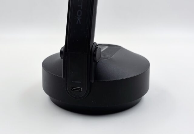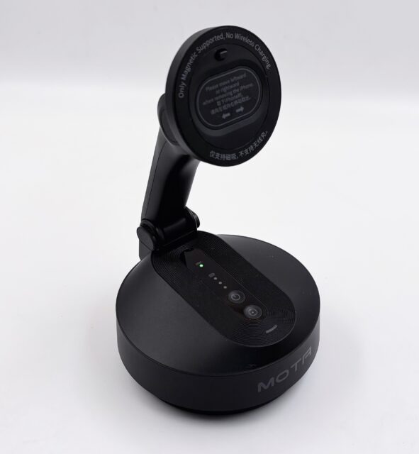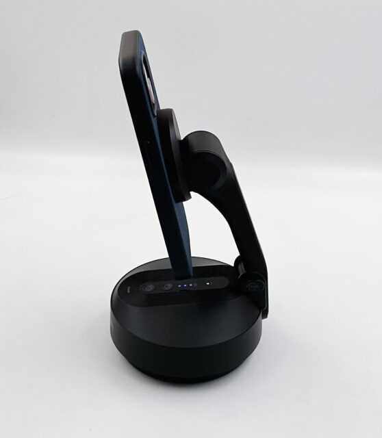 Le test du jour, c’est le Mota (Mobile + Table), mais je vous parlerais du Mogo (un stabilisateur) plus tard. Le Mota, donc, c’est un support de table, assez proche du modèle de Belkin sur le principe. Il se présente sous la forme d’une base noire (il existe en blanc selon la boîte), avec un bras (qui peut se replier en pressant un bouton sur la charnière) surmonté d’un support MagSafe aimanté. Il a une petite batterie intégrée (2500 mAh, aucune idée de la capacité en Wh), deux boutons et une prise USB-C pour la recharge.