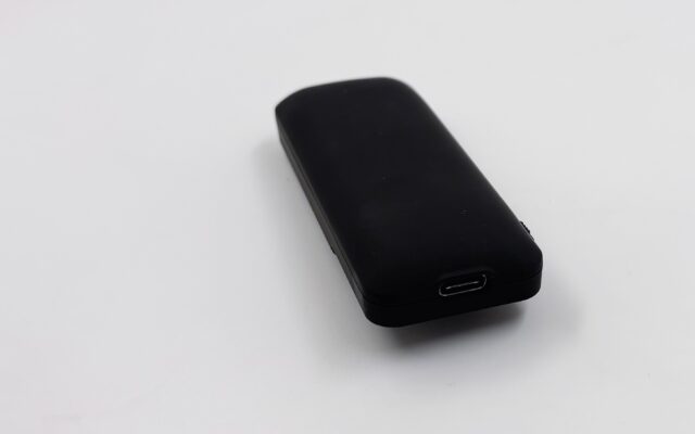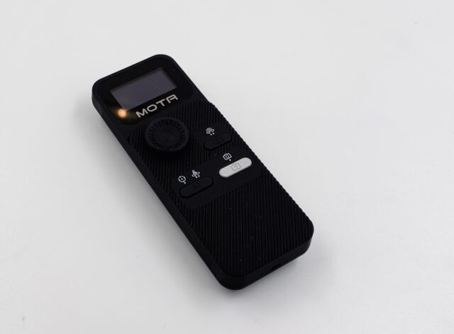 C’est la même que pour le Mogo, en noir. C’est un peu cheap et un peu bizarre, mais elle se recharge en USB-C et propose plus de fonctions. Pour l’appairage, il faut presser cinq fois le bouton Power sur l’appareil. Pour appairer la télécommande, il faut l’allumer (en pressant Power) puis presser le bouton cinq fois, en approchant la télécommande du Mota.