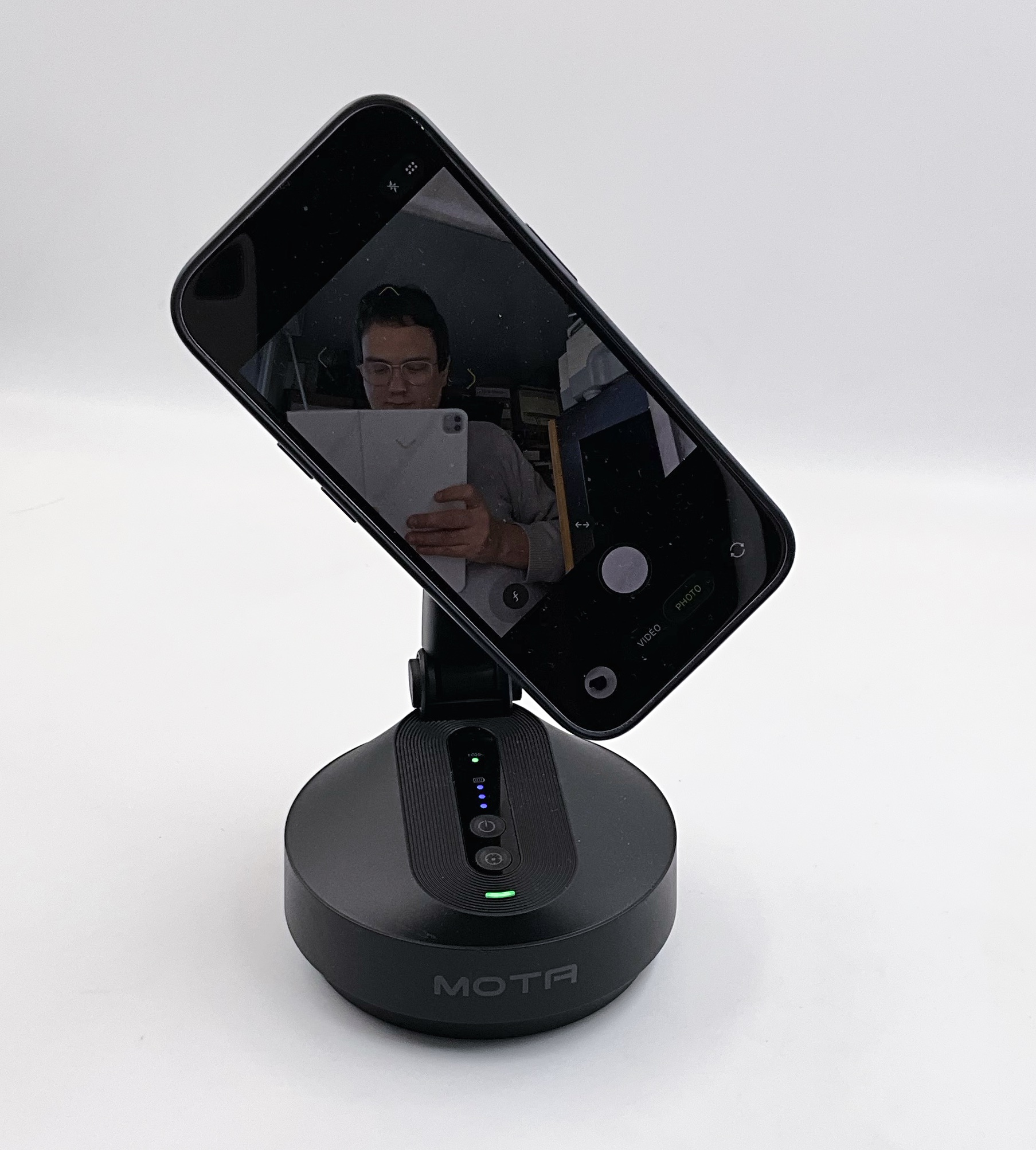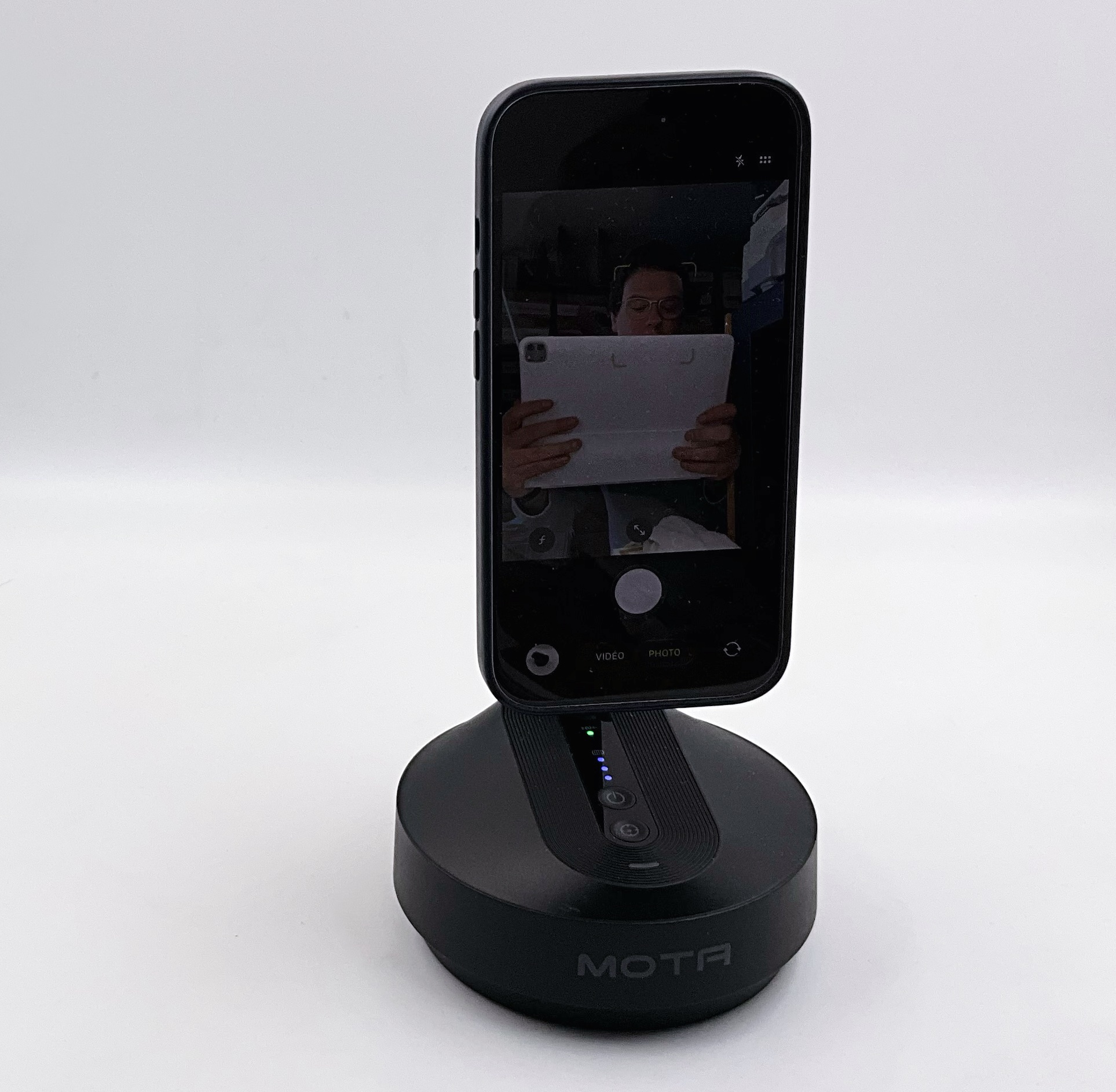 Le Mota bouge sur deux axes : il peut faire bouger l’iPhone au niveau du support MagSafe (90°) et la base tourne à 360°. Comme les autres produits DockKit, la configuration est simple : on met l’iPhone sur la base pour détecter la puce NFC qui lance l’appairage, et on attend. L’iPhone va ensuite contrôler l’appareil en Bluetooth. En théorie, l’iPhone se connecte directement dessus quand il est fixé, même si j’ai eu un peu plus de déboires qu’avec les autres : j’ai parfois dû éteindre et rallumer le Mota.