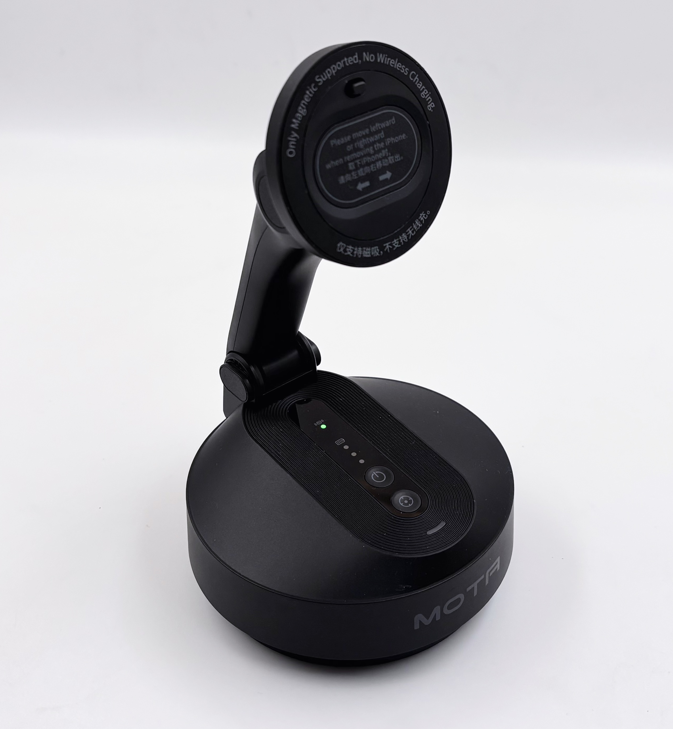 Par rapport aux autres produits DockKit, il y a deux choses à dire. La première, c’est que le Mota, contrairement au modèle de Belkin, ne charge pas l’iPhone. Le support MagSafe, avec les aiments, ne sert qu’à fixer l’iPhone sur le bras. Le second point, c’est que le support est totalement circulaire, ce qui ne permet pas de forcer l’iPhone à la verticale. Sur les stabilisateurs, une encoche aimantée permet de bien orienter l’iPhone, mais ce n’est pas le cas ici, comme sur le Belkin. Il peut donc être de guingois.