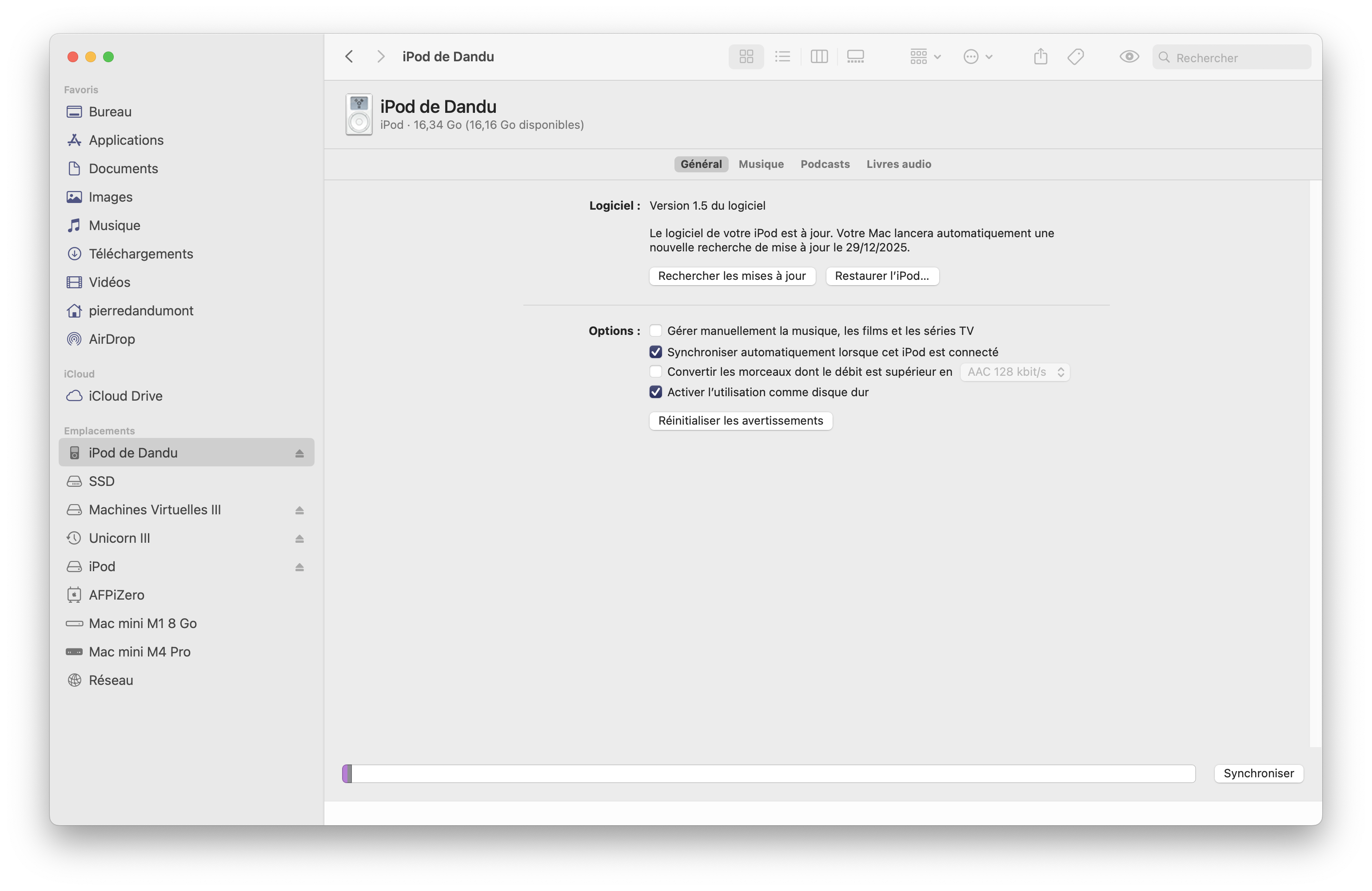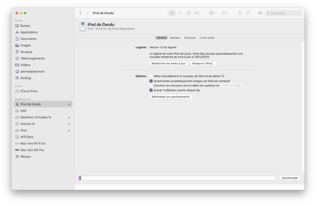 Je suis étonné que vous arriviez à le synchroniser avec Sequoia. Apple a discrètement supprimé la synchro avec les iPod FireWire avec macOS 15.4.1 et l’iPod ne peut plus se connecter avec le Mac « The device could not be found ». Sur Reddit le problème est connu et il n’y a aucune solution … à part passer par un PC.