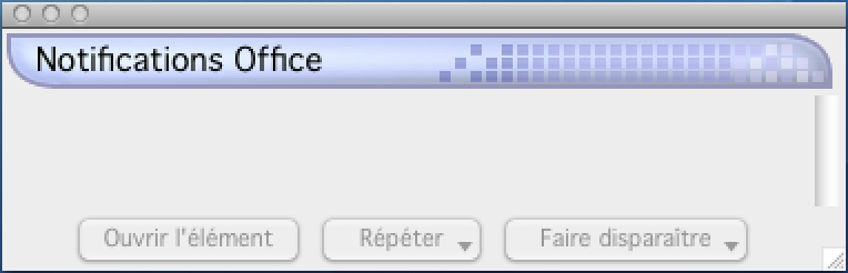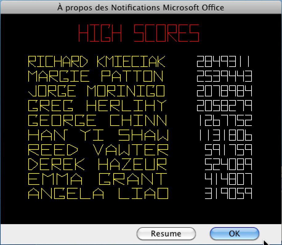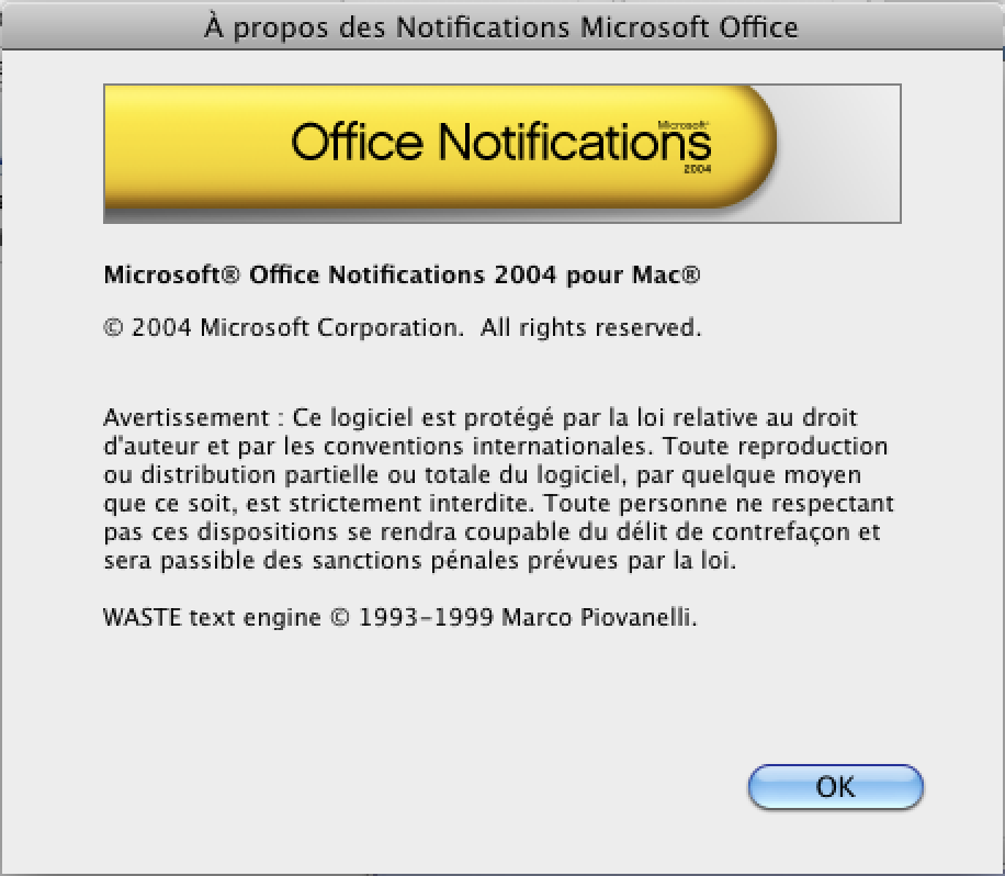 L’Easter Egg repose sur Microsoft Office Notifications. Et pour pouvoir lancer Microsoft Office Notifications, qui se trouve dans le dossier Office du dossier Microsoft Office 2004, j’ai d’abord dû lancer Entourage. Dans ce dernier, j’ai fait Entourage -> Désactiver les notifications Office, puis Entourage -> Aciver les notifications Office. Sans cette manipulation, le programme se coupe automatiquement.