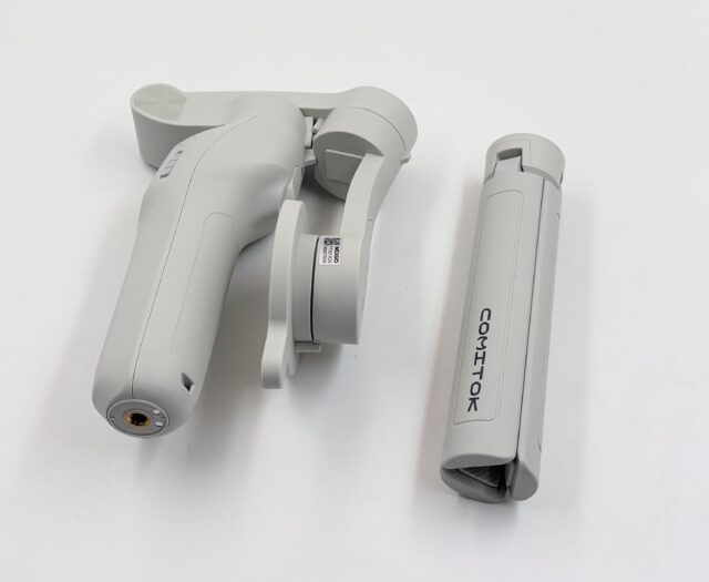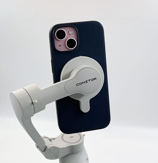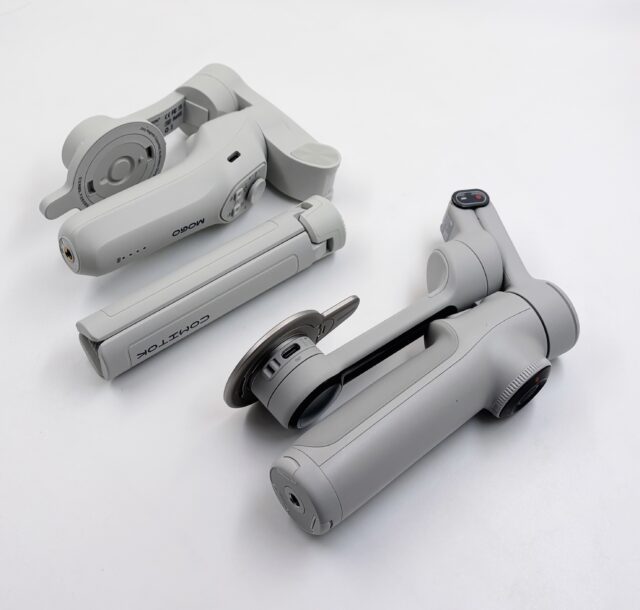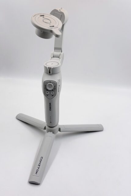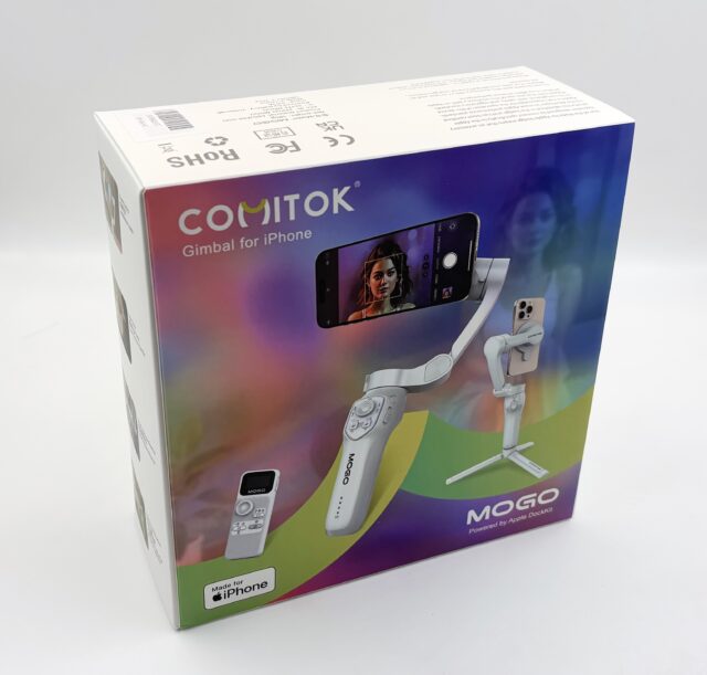 Maintenant, le stabilisateur DockKit de Comitok (une marque chinoise), le Mogo (Mobile + Go). C’est un modèle d’entrée de gamme, vendu seulement 50 € sur Amazon. C’est nettement moins que le Flow 2 Pro d’Insta360 (que j’ai testé et que j’utilise), qui vaut trois fois plus. On peut aussi le comparer au support de Belkin, qui a été retiré de la vente et rappelé (et pour une bonne raison : il peut réellement s’enflammer).