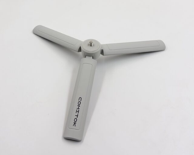 D’un autre côté, il a un défaut : il est fourni avec un trépied externe. Le Flow 2 Pro a un trépied caché dans le pieds, le Belkin est un vrai support. Ici, il y a un pas de vis standard dans la poignée et un trépied déployable fourni. La marque propose une base (qui permet aussi de charger la batterie) mais ce n’est pas disponible dans nos contrées. Le choix du trépied externe a un petit avantage tout de même : il est plus gros et donc plus stable que celui intégré dans le Flow 2 Pro.