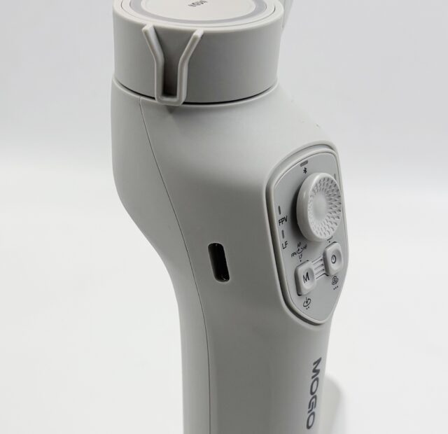 Le bouton Power a plusieurs fonctions. Une pression longue permet d’allumer et éteindre le stabilisateur, une pression simple change l’orientation du smartphone (paysage ou portrait) et une tripe pression permet de passer de la caméra arrière à la caméra frontale. Je peux regretter une absence, le fait que le stick tourne sur lui-même mais sans fonction particulière (comme un zoom par exemple).