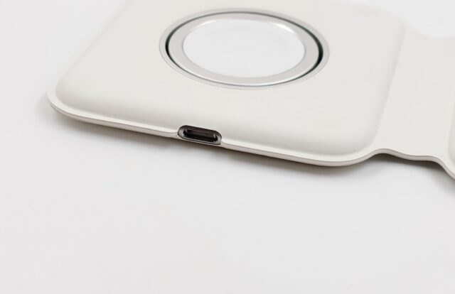 Le second bloc est pour les Apple Watch et certains boîtiers d’AirPods. Il est placé à plat par défaut, mais si vous avez une Apple Watch avec un bracelet fermé, il peut se rabattre à la verticale. C’est aussi pratique sur une table de nuit, pour passer la montre dans le mode idoine. Là encore, c’est un truc qui permet de voir facilement une copie : le modèle a un cerclage en métal et une charnière en métal, certaines copies sont en plastique. Attention, il ne propose pas la charge rapide introduite avec les Apple Watch Series 7 et donc ça peut être assez lent. Si vous avez l’habitude de charger la nuit, ce n’est pas un réel défaut, mais si vous mettez la montre sur son chargeur pendant la douche le matin pour avoir assez de jus pour la journée, ça va être compliqué.