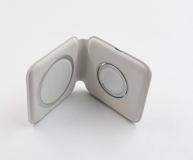 Le MagSafe Duo se présente sous la forme d’un bloc de 7,5 cm de côté et de 1,5 cm d’épaisseur, une fois replié. Il s’ouvre en forçant un peu (les aimants sont assez forts, au moins sur l’original) pour exposer deux zones de charge. La première est du MagSafe de première génération, soit du Qi capable d’atteindre 14 W avec des aimants. On peut charger un iPhone en MagSafe ou n’importe quel appareil en Qi, il faut juste penser à bien aligner. Ça fonctionne avec les AirPods si vous avez le bon boîtier (attention, certains sont Qi mais pas MagSafe). On fait mieux en 2026 et les iPhone (dès l’iPhone 16) peuvent charger à 25 W en Qi2 ou avec la dernière version du MagSafe, mais la charge à 14 W reste assez correcte tout de même.