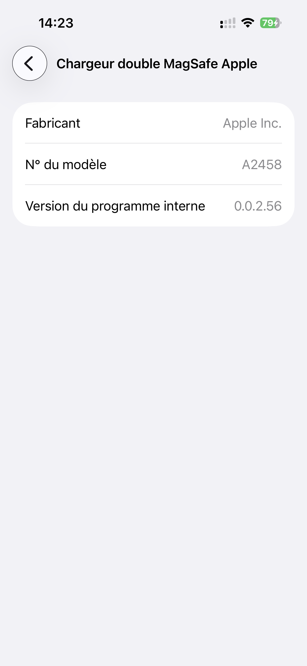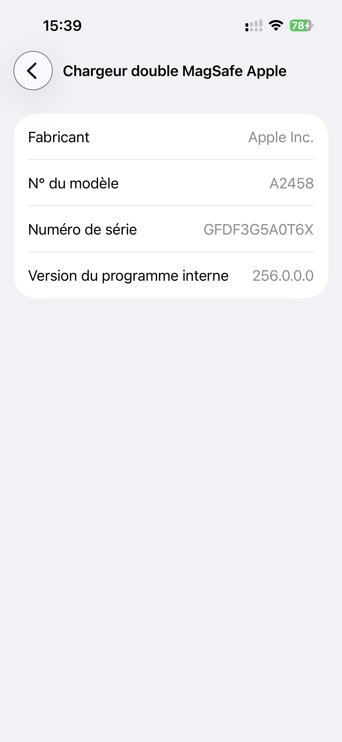 Ce n’est pas forcément une évidence, mais le chargeur a un firmware. Il peut se mettre à jour de façon automatique en branchant l’iPhone assez longtemps, visiblement. Quand je l’ai reçu, il était en version 0.0.2.56. Après la mise à jour, il est passé en version 256.0.0.0 et iOS a commencé à afficher son numéro de série. Je n’ai aucune idée des changements effectués, Apple ne documente pas ça.