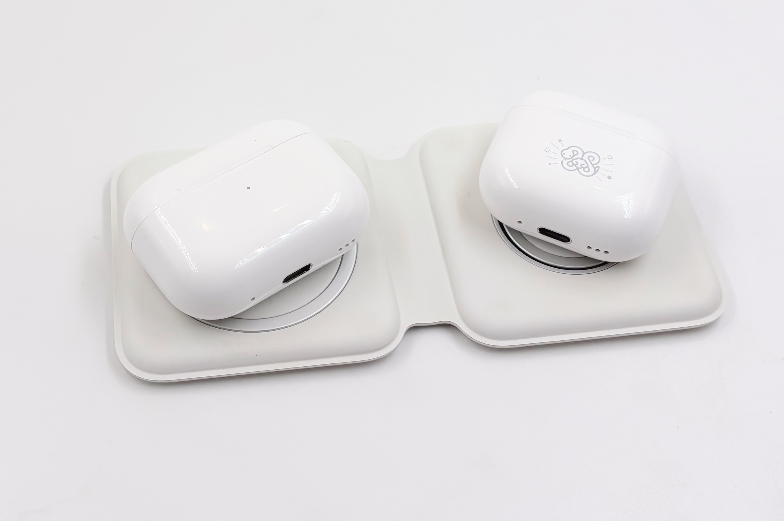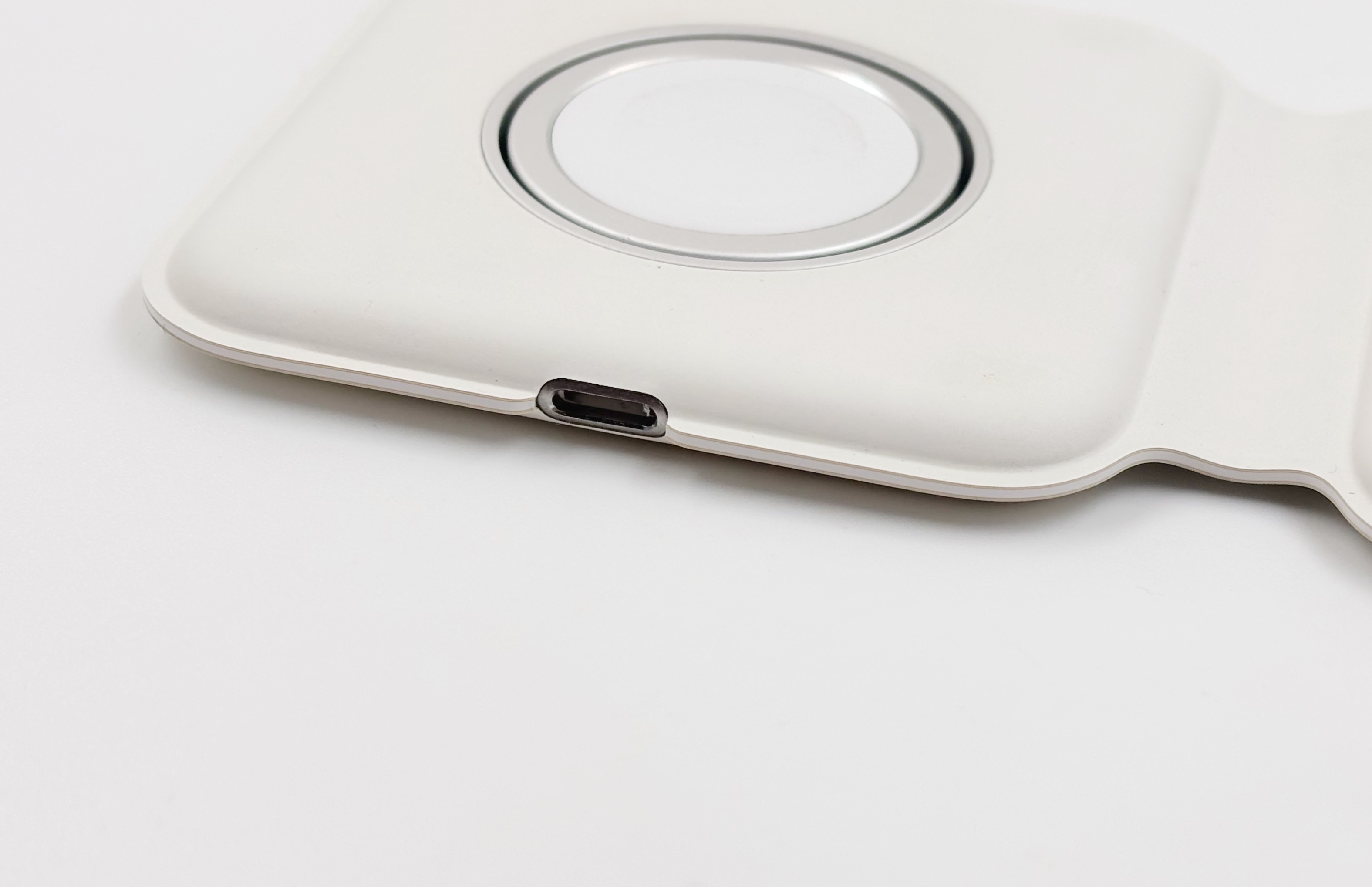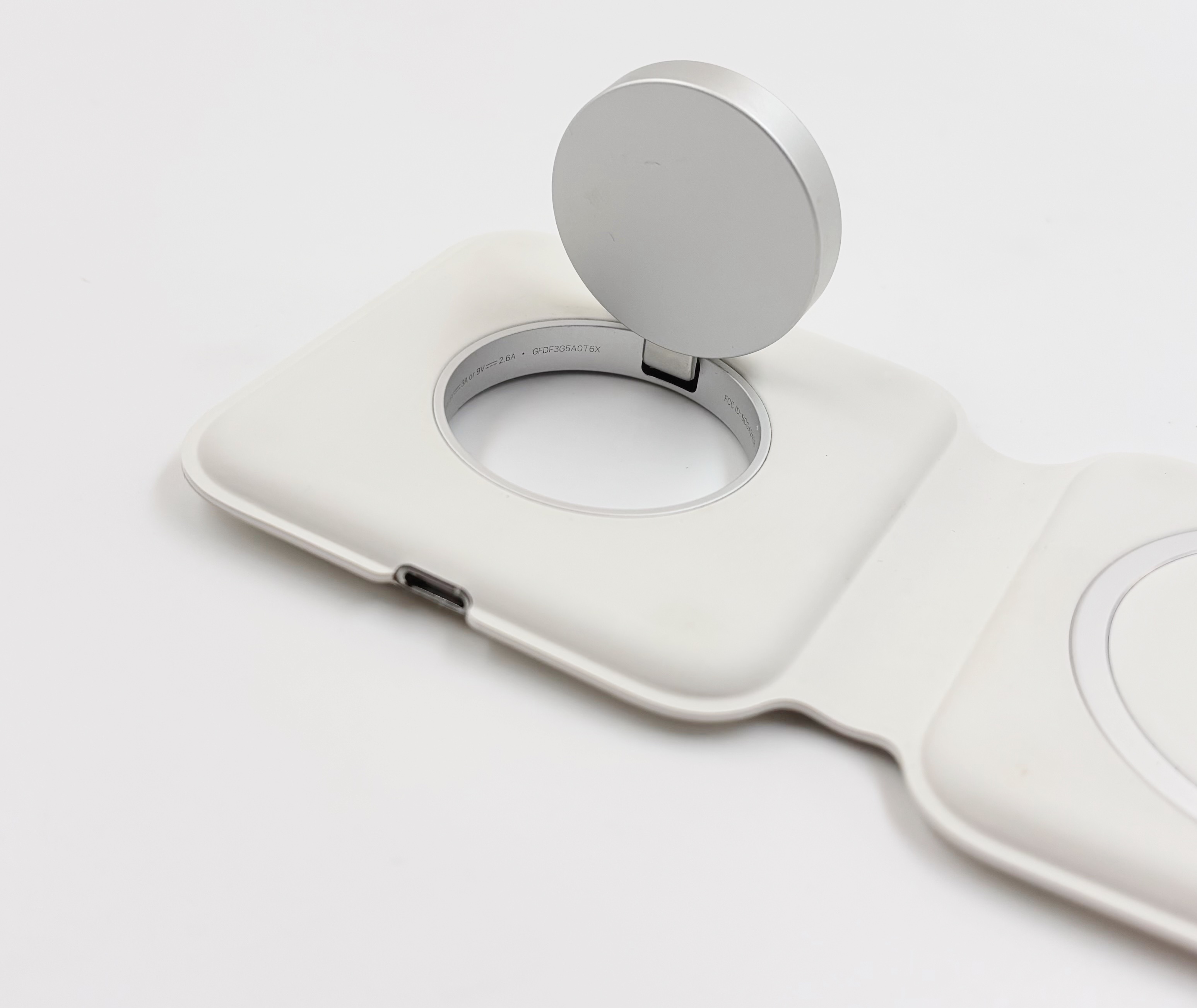 Le MagSafe Duo se présente sous la forme d’un bloc de 7,5 cm de côté et de 1,5 cm d’épaisseur, une fois replié. Il s’ouvre en forçant un peu (les aimants sont assez forts, au moins sur l’original) pour exposer deux zones de charge. La première est du MagSafe de première génération, soit du Qi capable d’atteindre 14 W avec des aimants. On peut charger un iPhone en MagSafe ou n’importe quel appareil en Qi, il faut juste penser à bien aligner. Ça fonctionne avec les AirPods si vous avez le bon boîtier (attention, certains sont Qi mais pas MagSafe). On fait mieux en 2026 et les iPhone (dès l’iPhone 16) peuvent charger à 25 W en Qi2 ou avec la dernière version du MagSafe, mais la charge à 14 W reste assez correcte tout de même.