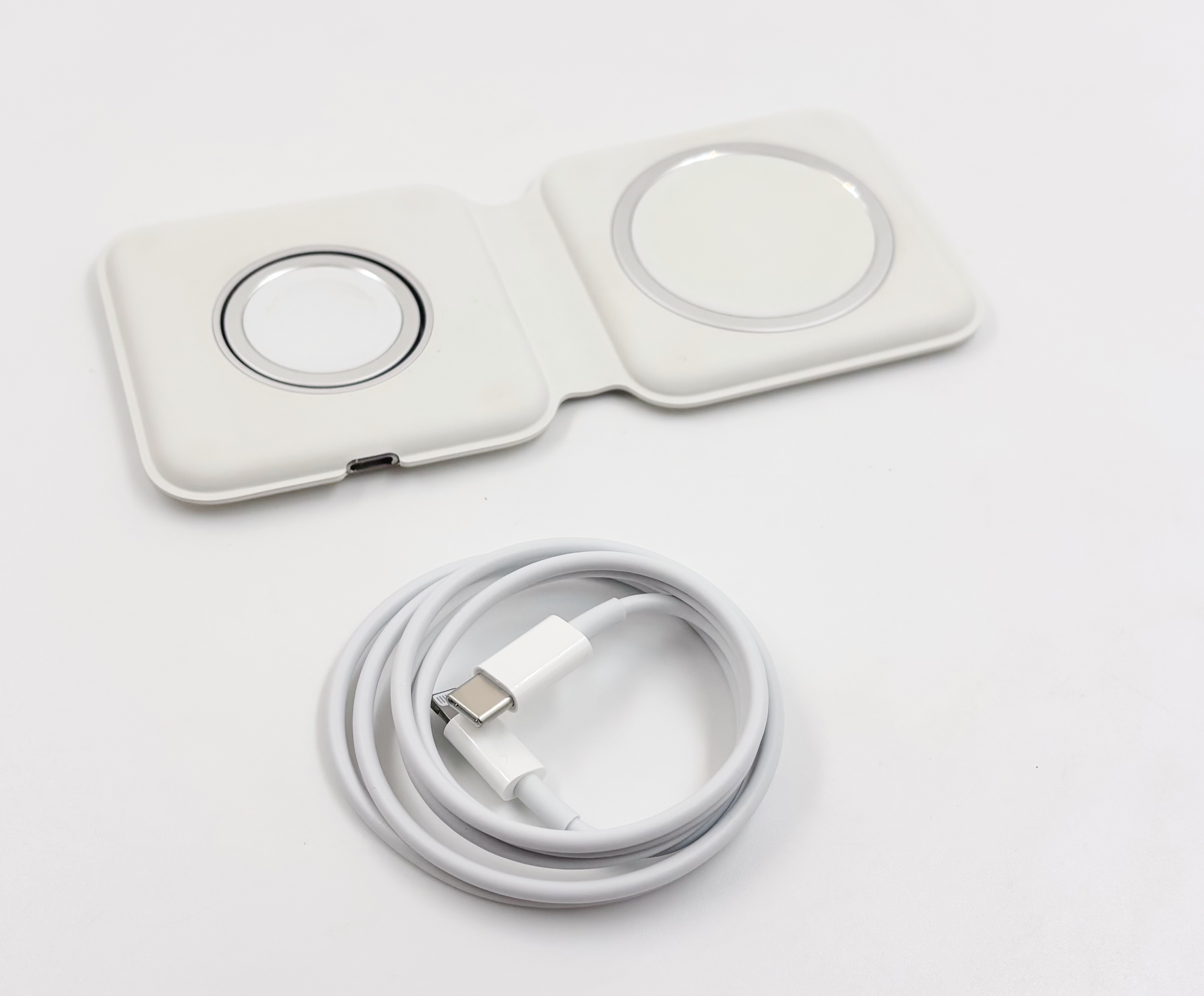 Le principal problème du MagSafe Duo, c’est tout de même sa prise Lightning. Pas vraiment à cause du Lightning (je trouve la prise plus pratique que l’USB-C), plus à cause du concept. Le MagSafe Duo est compact (même si un peu lourd, 133 grammes) mais il faut ajouter un adaptateur secteur USB-C pour que ça fonctionne correctement. Et pour obtenir une charge qui n’est pas trop lente, il faut un modèle capable de fournir 30 W (en réalité, plus exactement 27 W, en 9 V et 3 A). Il faut aussi ajouter le câble, et c’est là que le Lightning peut devenir bloquant en 2026 : on ne peut pas partir du principe qu’il y aura un câble Lightning chez tout le monde. C’était déjà compliqué en 2020 à la sortie, mais ça l’est encore plus actuellement. Donc il faut prévoir a minima un câble USB-C vers Lightning quand on se déplace. Les versions modernes, tissées, sont plus pratiques que celle de l’époque, d’ailleurs.