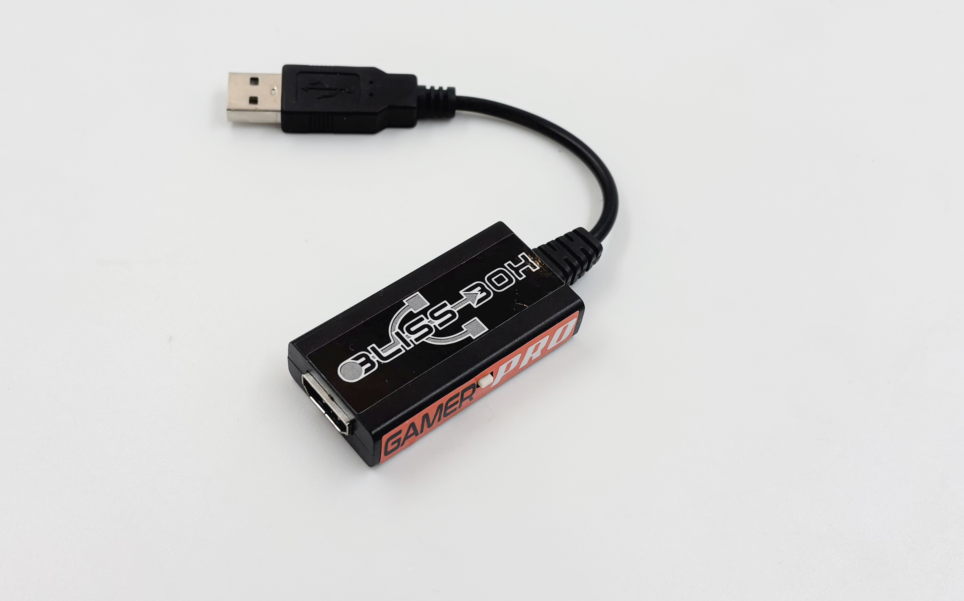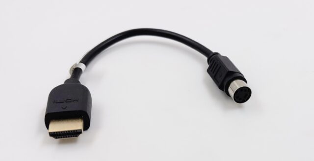 Les produits de Bliss-Box permettent de relier des manettes issues de vieilles consoles à un système moderne, en USB. L’ensemble se compose de deux choses : un premier adaptateur avec une prise USB-A mâle et une prise HDMI femelle, et un second adaptateur avec d’un côté une prise HDMI mâle et de l’autre une prise femelle pour les manettes. Dans le cas de la Pippin, c’est une prise Mini DIN 4, soit de l’ADB. J’ai un Gamer Pro classique en version simple (pour une seule manette) mais il y a des versions plus évoluées qui acceptent directement plusieurs manettes. La marque propose aussi de travailler en mode bridge avec des adaptateurs précis, mais je n’ai pas le nécessaire. L’idée est d’utiliser une manette d’une autre marque à la place de l’originale, avec du matériel qui s’occupe de la conversion. Dans l’ensemble, les produits semblent bien pensés, mais la finition est moyenne. C’est quand même assez cheap tant le plastique que les stickers), mais ça fonctionne.