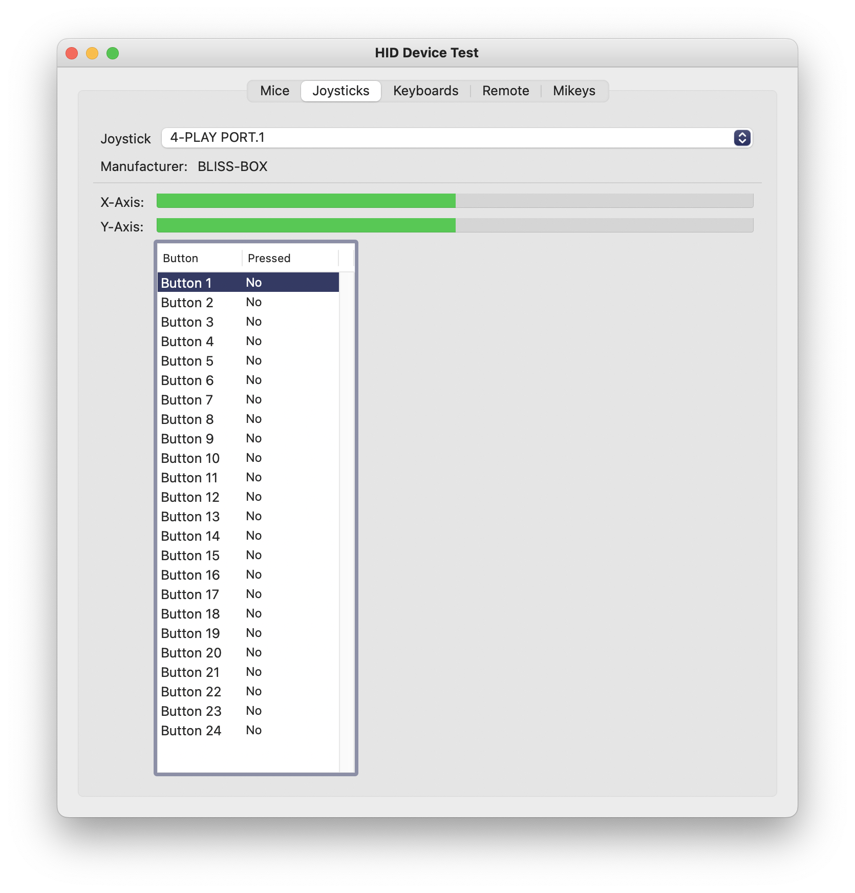 Avec une manette de Pippin classique, ça fonctionne exactement de la même façon, et c’est normal : les manettes sont totalement identiques en dehors de la prise. J’ai aussi tenté avec mon pavé numérique, mais il active juste un des boutons (celui du clic gauche). Avec une souris, on a bien les axes, mais le bouton est bloqué.
