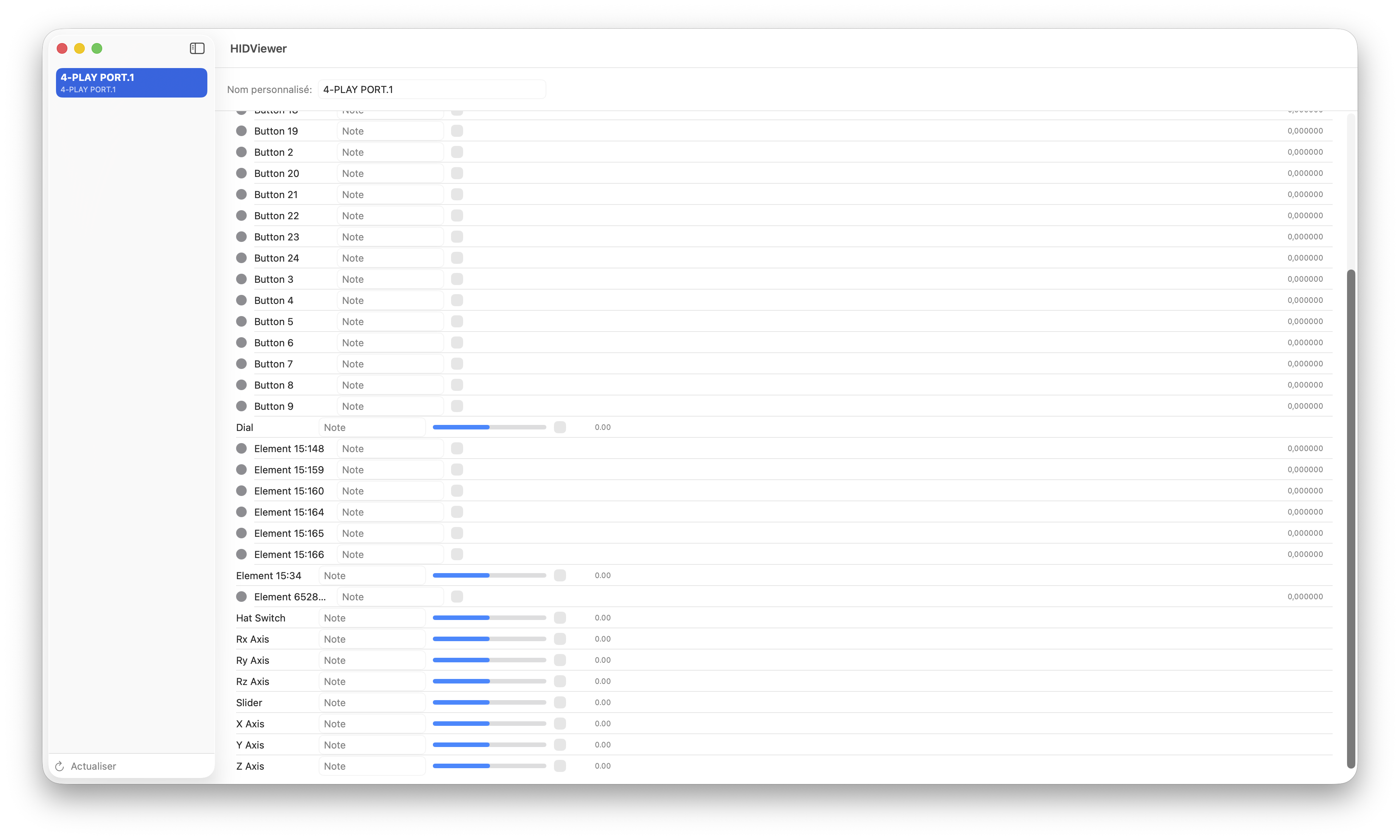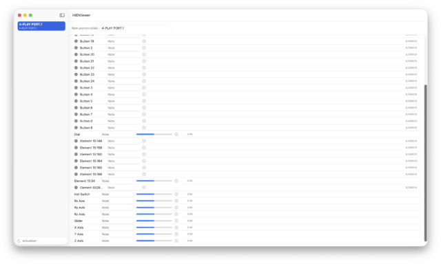 Dans des outils de test, elle est reconnue directement en USB HID. Les quatre boutons principaux sont reliés aux boutons 1 à 4, ensuite il y a deux des boutons inférieurs qui sont les 5 et 6, puis les deux gâchettes sont 7 et 8 et le dernier bouton inférieur (celui de droite) est le 9. C’est un peu bizarre mais ça reste globalement logique. Attention, l’adaptateur expose vingt-quatre boutons en USB. La croix directionnelle est exposée comme un axe analogique, ce qui est courant, avec uniquement les valeurs 0 et 1 (dans sans analogique). Le trackball, lui, est exposé comme un axe Z et Rz, avec des valeurs analogiques. C’est un peu bizarre et probablement inutile, mais dans certains cas, ça peut remplacer un stick analogique. Dans mes essais, ce n’est pas très efficace pour autant : même un mouvement rapide donne une réponse assez faible sur les valeurs.