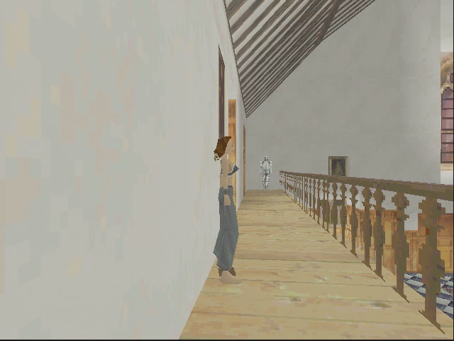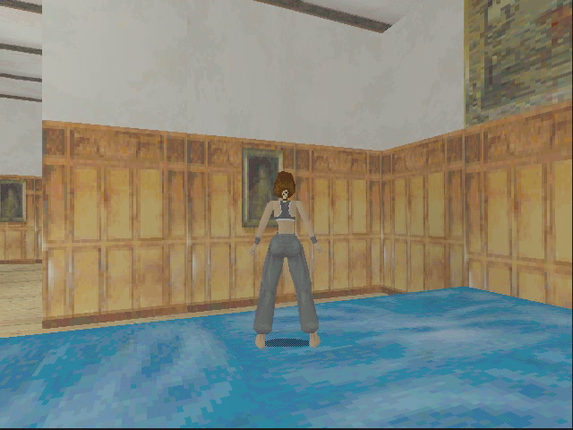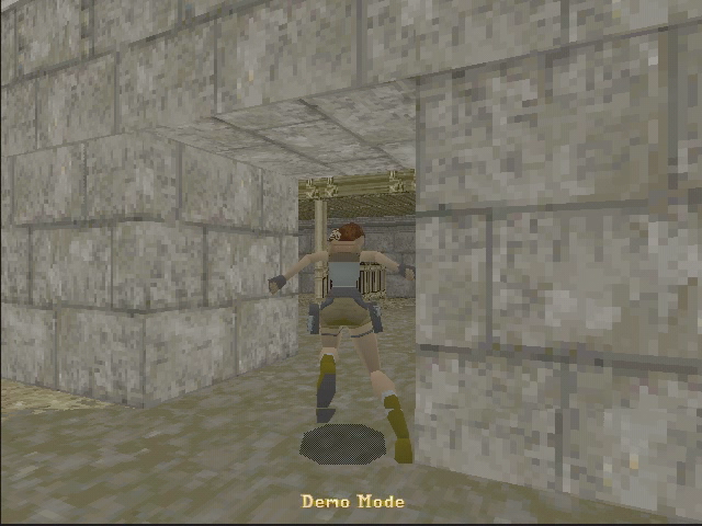 Par défaut, le jeu est en 640 x 480 avec une carte 4 Mo, et c’est plutôt fluide, plus qu’avec une carte S3 Virge en tout cas. Mais on a aussi les défauts de la Matrox Mystique, en pratique : pas de filtrage bilinéaire et pas de prise en charge de la transparence. On a donc une image globalement pixellisée, et avec des ombres de très mauvaise qualité. C’est visible sous Lara : c’est juste un quadrillage noir. Le jeu n’affiche pas les images/s comme d’autres versions 3D, mais c’est quand même nettement mieux que sur la S3 Virge, mais pas aussi bien que sur les PowerVR ou les 3dfx. On peut noter que la carte fait la correction de perspectives…