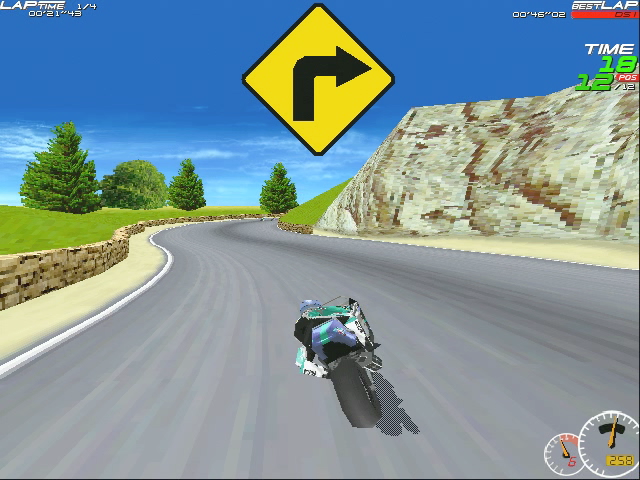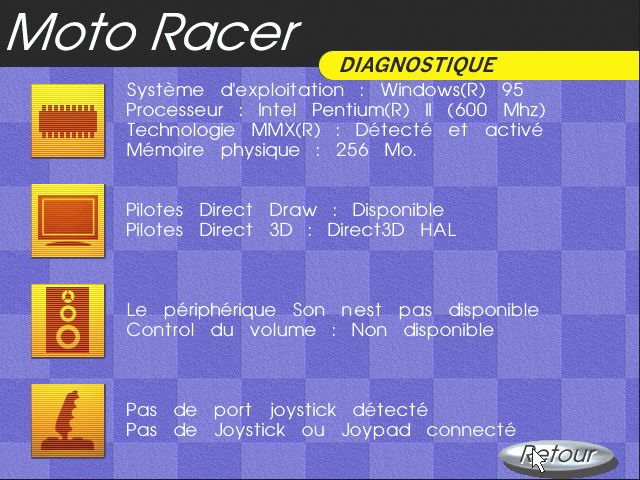 Moto Racer est un de mes jeux préférés. Il y a une version pour Matrox Mystique, mais elle est un peu particulière : c’est une version OEM qui a été livrée avec des cartes Matrox il y a longtemps. On peut trouver une image de la version en question sur ce site. Cette version n’est pas pensée pour l’API de Matrox, assez bizarrement, mais c’est une version Direct3D optimisée pour la carte. C’était déjà le cas avec la version PowerVR du jeu, d’ailleurs. Visuellement, je n’ai pas vu beaucoup de différences avec la version classique, mais bon, il y a un joli message au démarrage. Par contre, c’est plus rapide, c’est évident : le jeu est un peu plus fluide avec la version optimisée. Mais on est dans le même cas que Tomb Raider : sans filtrage ni transparence, on est est assez loin visuellement des autres cartes 3D de l’époque.