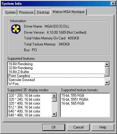 La mienne est une Mystique 220 avec 4 Mo de RAM (je n’ai pas l’extension) et une fréquence de 66 MHz pour le GPU (100 MHz pour la mémoire). Comme prévu, c’est une carte qui offre une excellente image en 2D. Pour la 3D, elle est compatible Direct3D (les derniers pilotes sont là) mais la compatibilité est mauvaise, même sans prendre en compte les défauts techniques. Matrox avait sa propre API, MSI (Matrox Simple Interface), avec une grosse douzaine de jeux. Il y a Screamer 2, Destruction Derby 2 ou Tomb Raider (le premier) dans le tas. Vu les limites sur les fonctions, les jeux optimisés ne sont pas nécessairement améliorés d’un point de vue visuel directement, mais au moins plus rapide, avec la possibilité de monter en définition. Vous trouverez quelques infos en plus sur Vintage3D mais dans mon cas, je n’ai pas réussi à lancer Final Reality, par exemple.