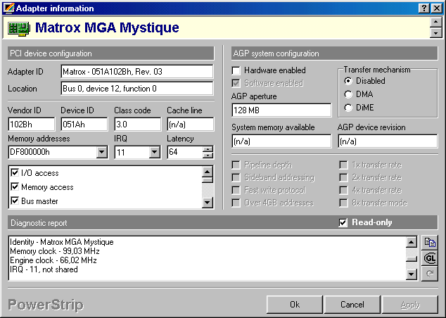 Au passage, il y a deux versions de la puce : MGA1064SG et MGA1164SG. En théorie, les Mystique 220 sont sur la seconde, mais ce n’est pas systématique. La mienne est une Mystique 220 selon l’étiquette et elle a une MGA1064SG.