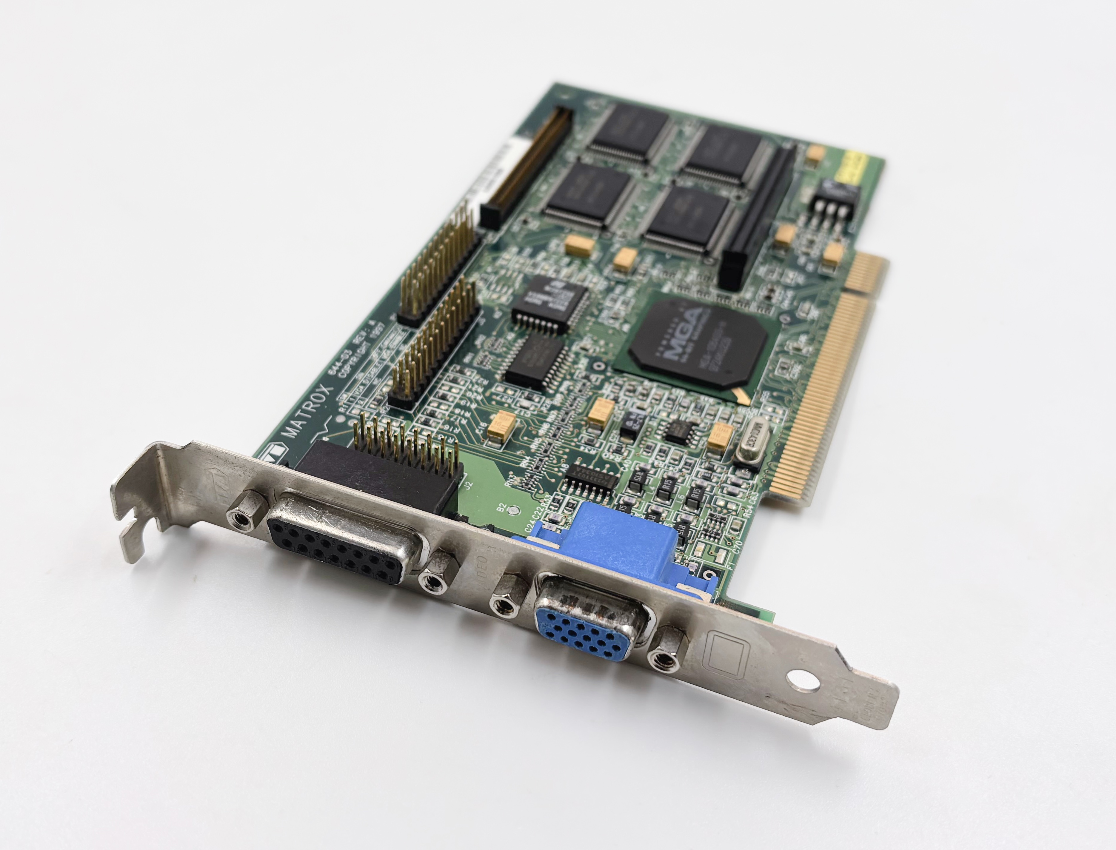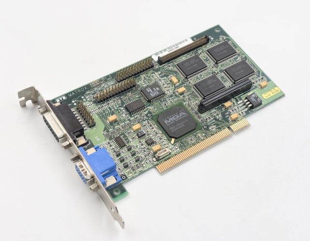 La Matrox Mystake Mystique, c’est quoi ? Une excellente carte graphique 2D des années nonante, avec des fonctions 3D franchement mauvaises. La page Wikipedia explique bien le contexte, mais la Matrox Mystique, dans sa version de base, est une Matrox Millenium (une bonne carte 2D avec une excellente qualité d’image) avec quelques fonctions 3D basiques. Elle ne propose pas de filtrage bilinéaire (le fameux flou des 3dfx), pas de prise en charge du brouillard et pas de gestion de la transparence. Dans les premiers jeux 3D, c’est quand même un problème : sans transparence, on se retrouve avec des ombres qui sont juste un quadrillage noir affreux. La carte existe en plusieurs versions, celle d’origine avec un RAMDAC à 170 MHz qui limite un peu les performances en 2D, et la Mystique 220, qui a un RAMDAC à 220 MHz. Elle existe en version 2, 4 et 8 Mo (avec une extension) et on peut avoir des fréquences qui varient un peu.