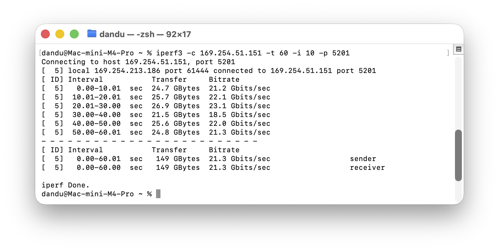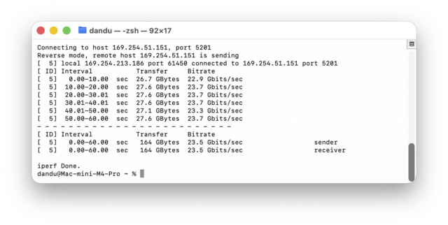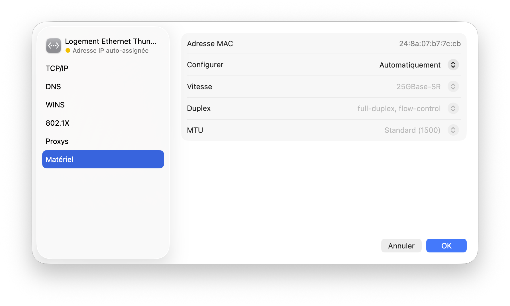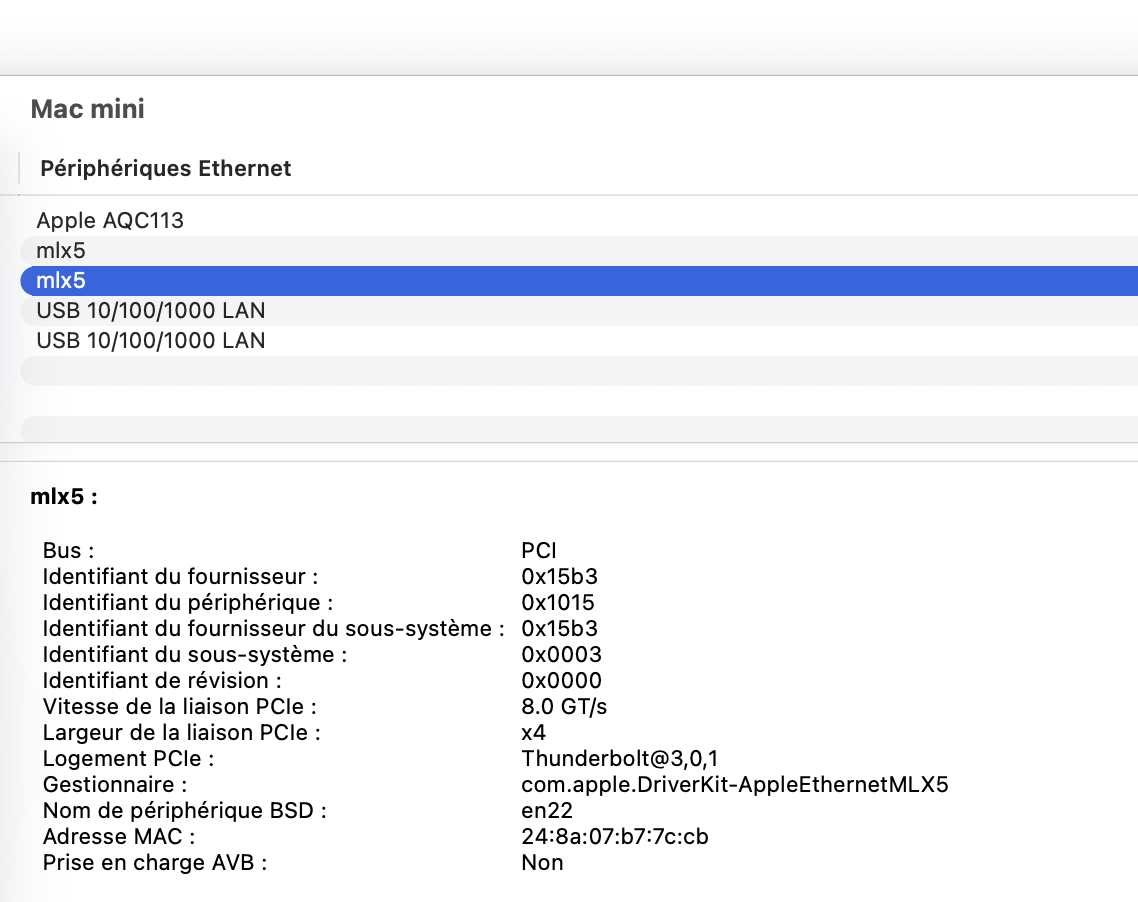 La carte est bien reconnue avec une liaison 25GBASE-SR selon macOS, et j’ai obtenu 23,5 Gb/s en reliant le Mac mini M4 Pro à un PC équipé de la même carte. C’est un peu plus qu’en USB4 et c’est probablement proche du maximum qu’on peut obtenir en pratique. La prochaine étape, ce sera probablement un jour de tester une carte Ethernet à 40 Gb/s : les ConnectX-4 40 Gb/s se trouvent assez facilement et macOS supporte ça. Mais bon, en pratique, je n’utilise déjà pas mes cartes Ethernet 25 Gb/s : l’Ethernet à 10 Gb/s suffit amplement pour accéder à mon Mac mini qui sert de NAS.