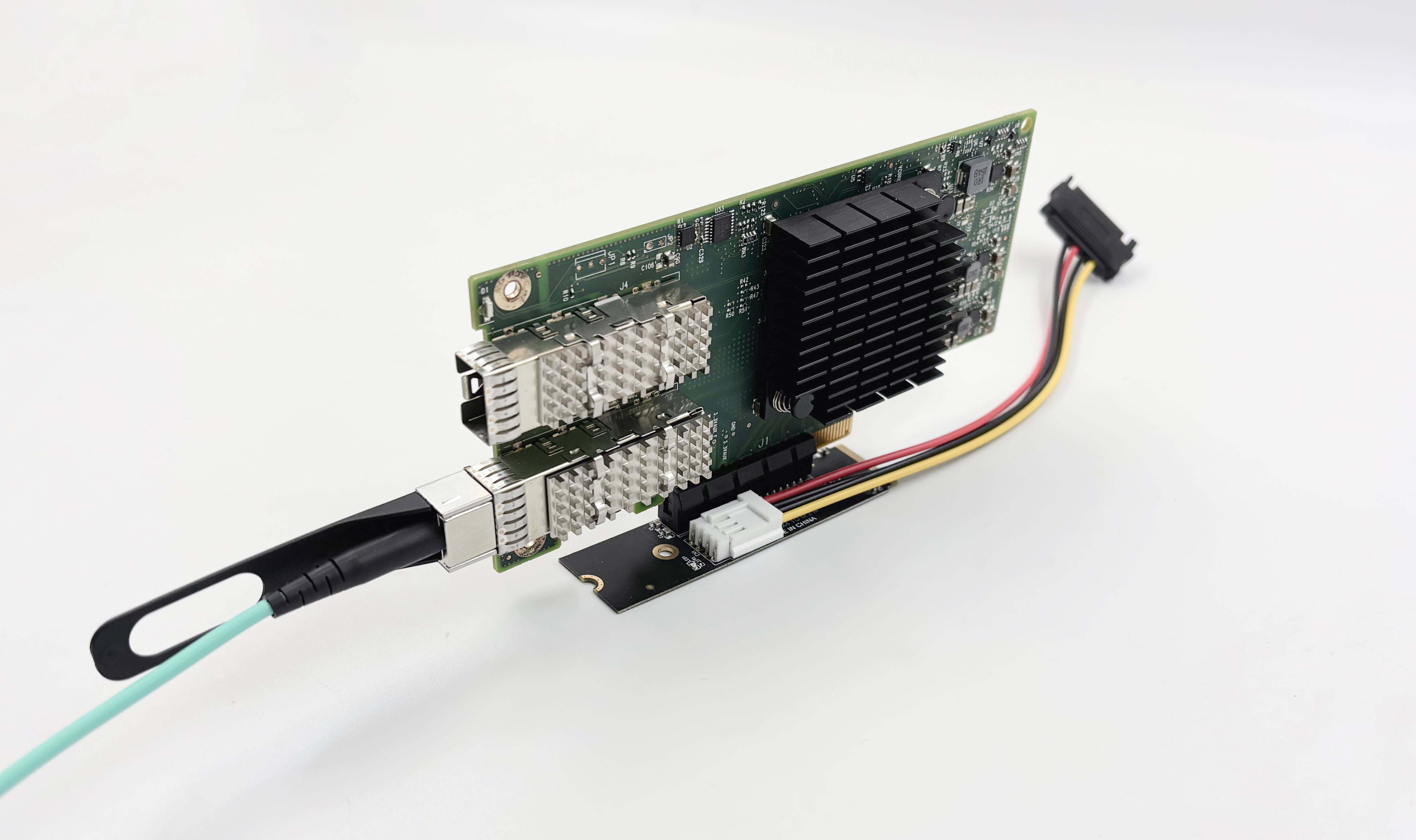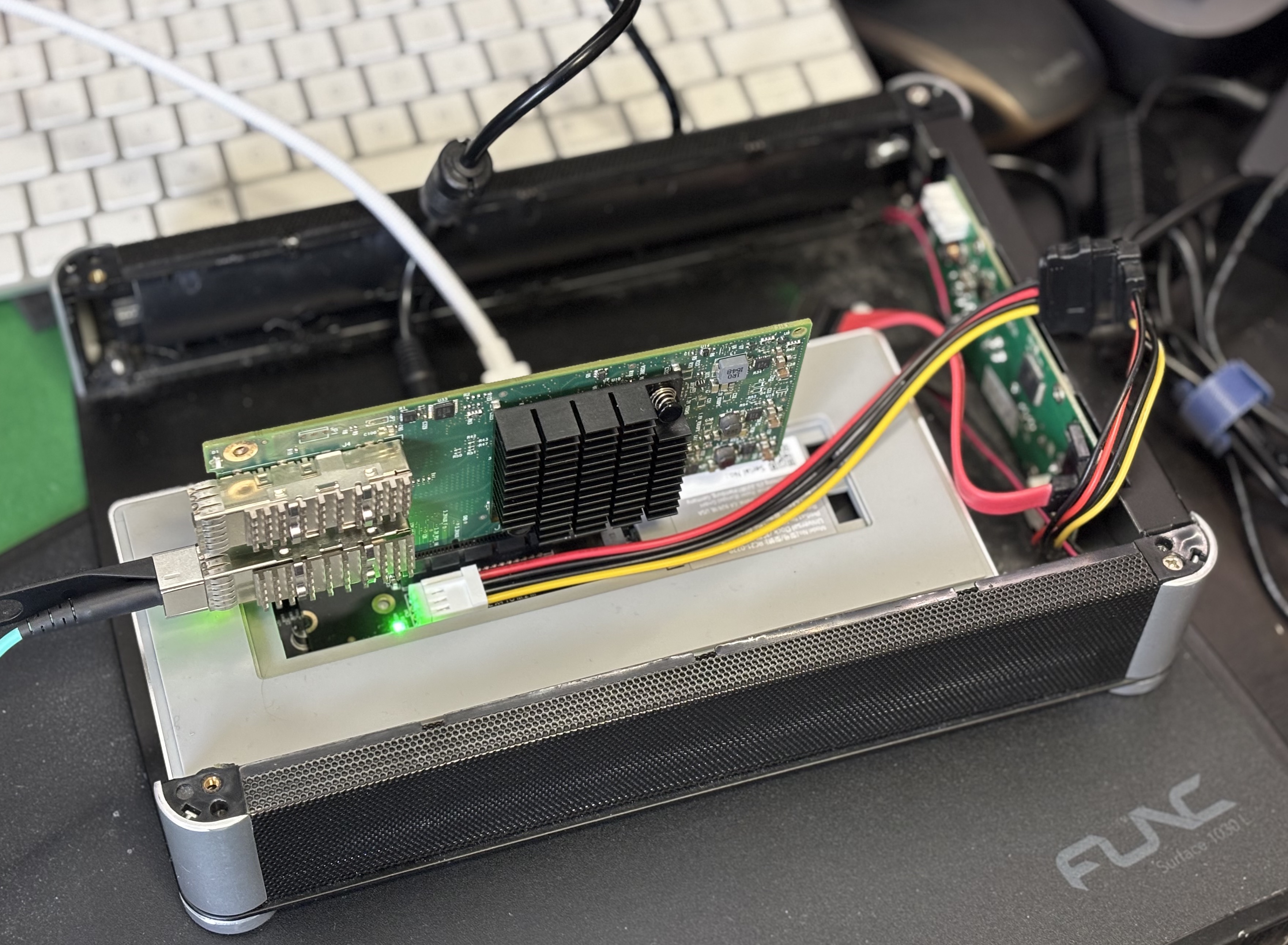 Ici, je suis passé en Thunderbolt 5. La norme permet 80 Gb/s, avec 64 Gb/s pour les données, ce qui est largement suffisant pour une liaison à 25 Gb/s. J’ai utilisé la même astuce que la dernière fois, qui est du bricolage : une station d’accueil Thunderbolt 5 (le modèle de Razer) avec juste un adaptateur M.2 vers PCI-Express noname. La station intègre en effet un emplacement M.2 pour un SSD. C’est clairement de la bidouille : l’emplacement est sous la station, il faut alimenter l’adaptateur en externe (en SATA), etc. Mais ça fonctionne.