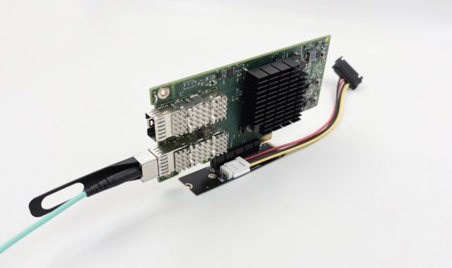 Depuis un moment maintenant, il est possible de connecter des cartes Ethernet à 25 Gb/s dans les Mac. Apple a intégré un pilote pour les cartes Mellanox ConnectX et on peut en trouver assez facilement d’occasion. Si vous avez un Mac Pro ou un Mac avec du Thunderbolt, il est donc possible de faire une liaison à 25 Gb/s assez facilement. Dans mes premiers essais, j’étais limité par le Thunderbolt 3 à environ 19 Gb/s, ce qui n’est pas si mal. Et j’avais utilisé un câble DAC de 3 mètres. Depuis, j’ai essayé en Thunderbolt 5 (et en USB4) et avec un câble AOC de 10 mètres. Je m’explique.