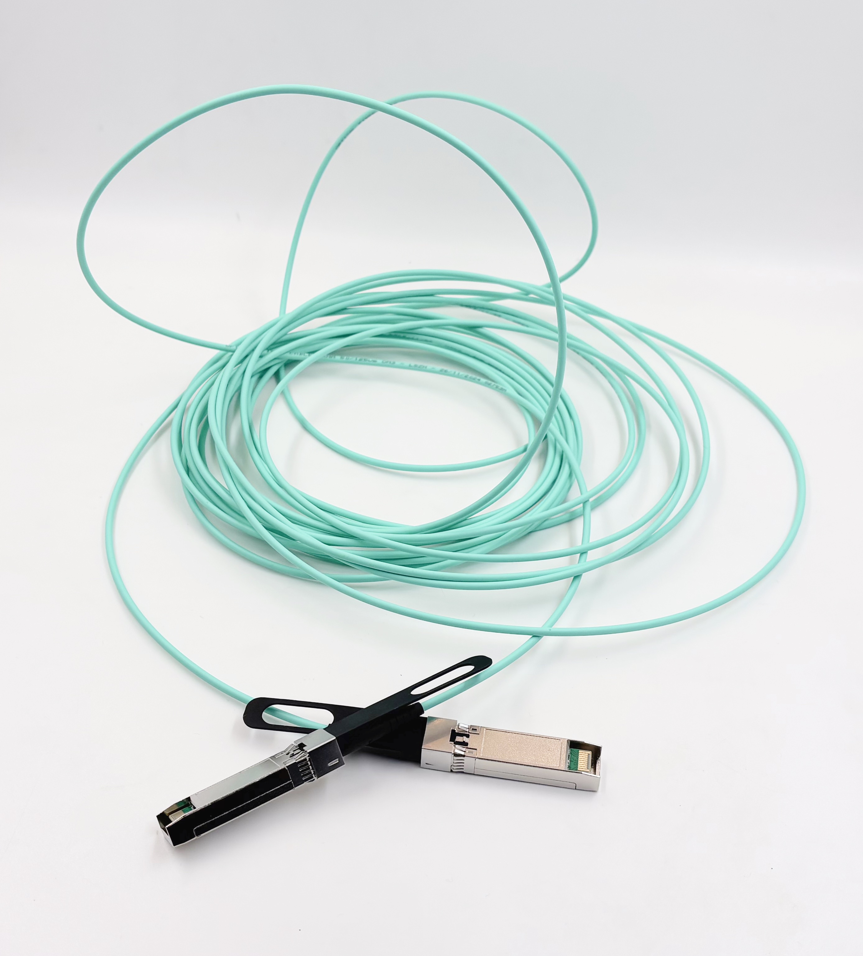 La troisième solution, c’est l’AOC, pour active optical cable. C’est le même principe : la fibre est fixée aux connecteurs SFP28. Vu que la prise est assez grosse, c’est compliqué à passer dans les murs, mais comme tout est soudé, c’est un peu moins cher. A 25 Gb/s, 10GTek (je prends cette marque parce que ce n’est pas cher) propose jusqu’à 10 mètres pour moins de 40 €. On a une seule fibre, assez flexible, et ça tient bien les débits.